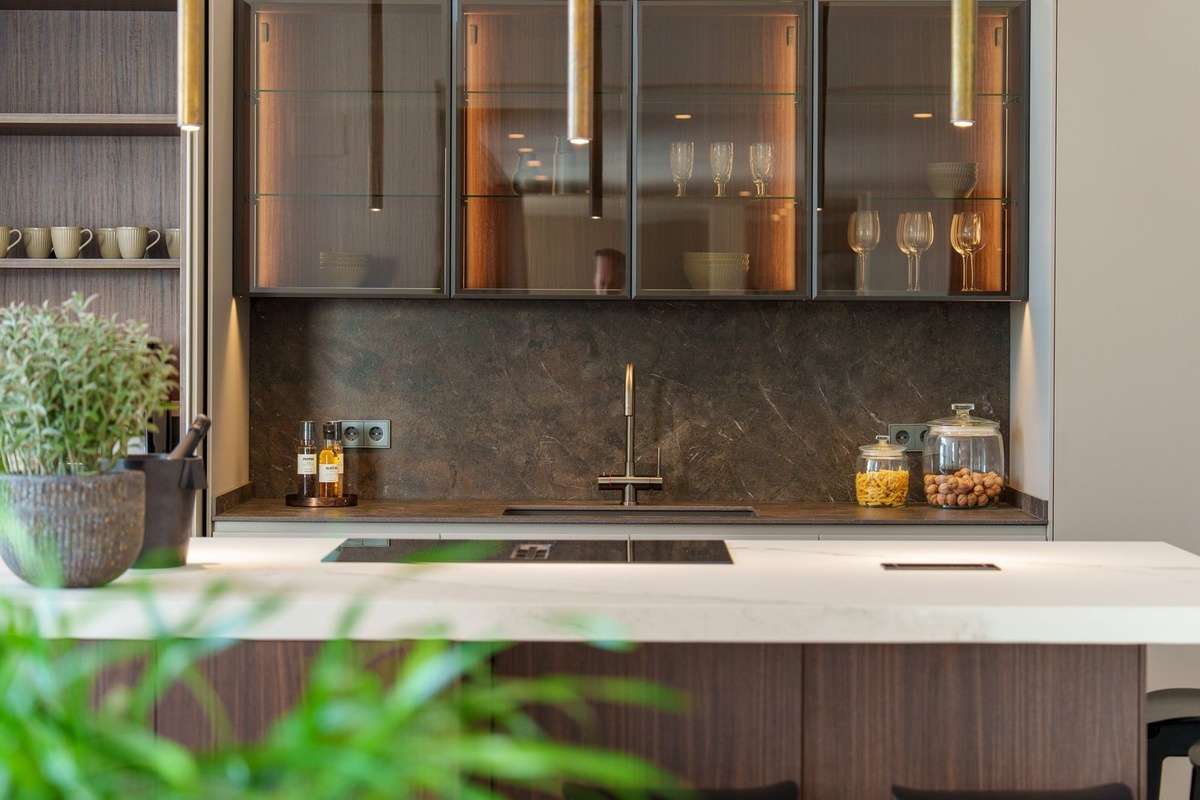Inside, a spacious open-plan living and dining area wraps around a striking statement kitchen with central island.