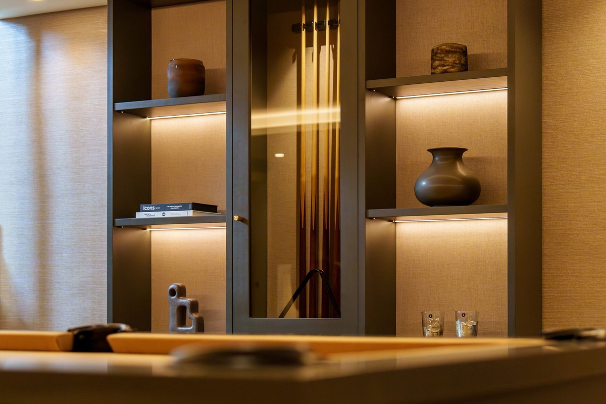 The lower level offers a sleek entertainment lounge complete with a bar, glass-fronted wine cellar, and billiards table, complemented by two guest WCs and ample storage space.