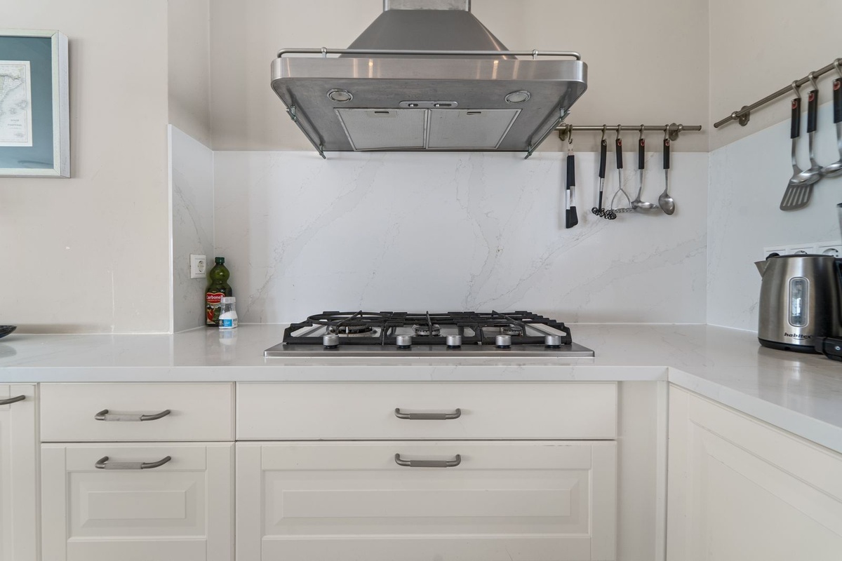 The open-plan kitchen seamlessly connects to the bright living area and opens onto the beautiful terrace – the heart of the home.