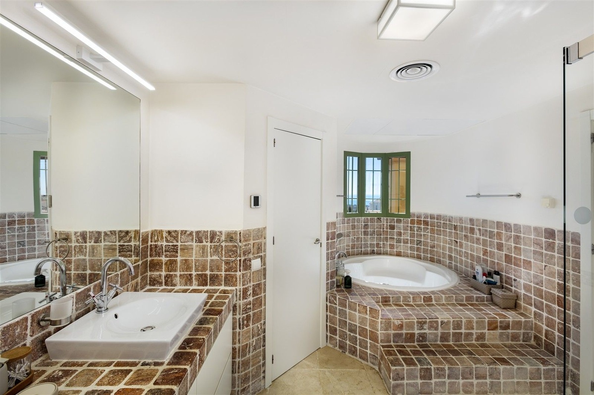 On the entrance level, you’ll find a generous living area with a cozy fireplace opening onto the terrace enjoying sea views, a fully remodeled kitchen, separate laundry room, guest toilet, and two spacious guest bedrooms. Upstairs, the master suite boasts its own private terrace, accompanied by an additional guest bedroom currently used as a home office, as well as a private sauna. Multiple terraces with varying orientations invite natural light throughout the day and create the perfect spaces for outdoor living, whether in sun or shade.