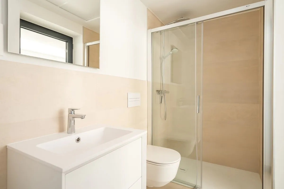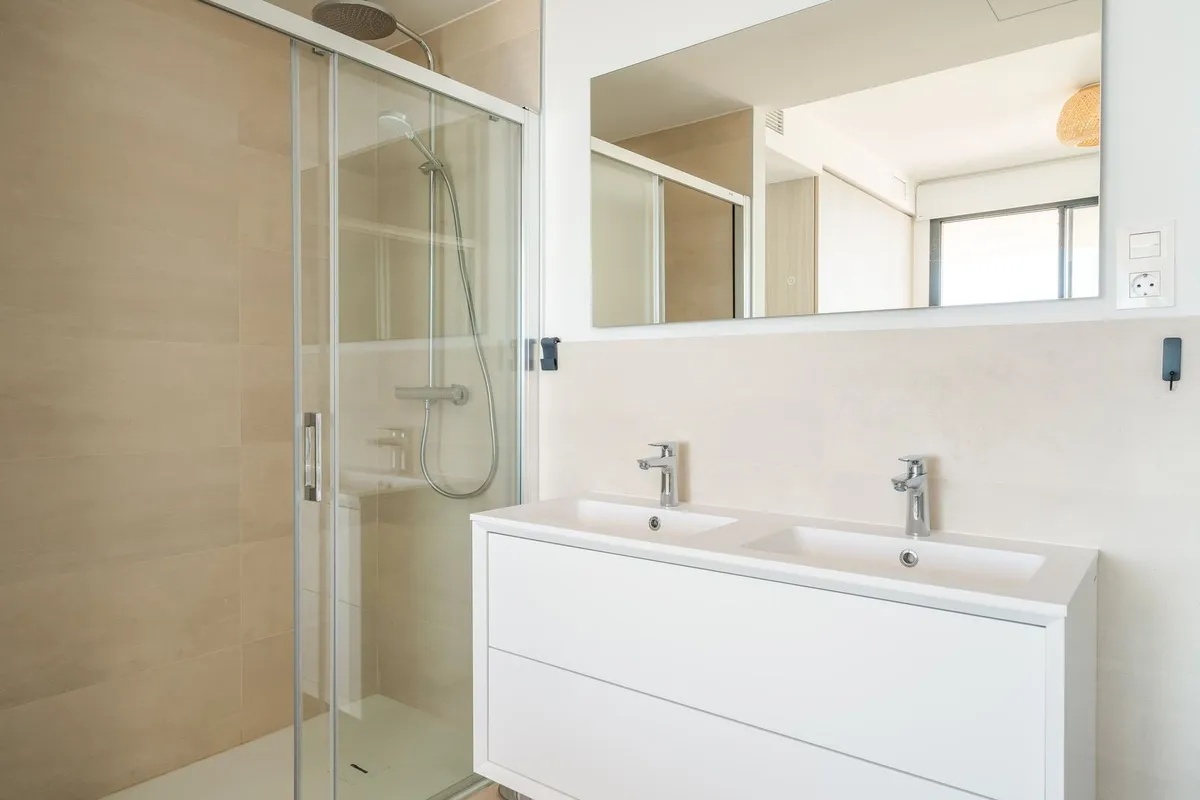 The apartment features a bright open-plan living and dining area with direct access to a spacious terrace showcasing panoramic views of the Mediterranean. The contemporary kitchen is fully equipped, and both bedrooms are generously sized, with the master suite offering an en-suite bathroom and built-in wardrobes. The finishes are of high quality throughout, making this a move-in-ready home.