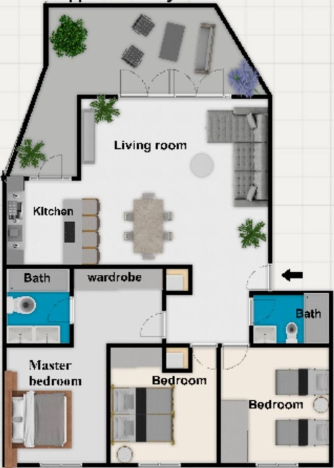 Two guest bedrooms with twin beds (convertible to doubles), large built-in wardrobes, and a shared modern bathroom