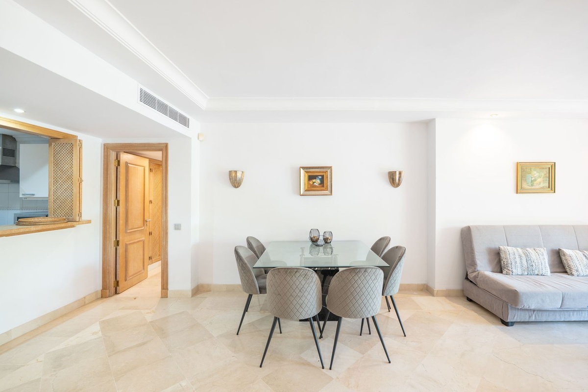 This elegant apartment offers two spacious bedrooms, each with its own en-suite bathroom and large walk-in wardrobes, ensuring comfort and privacy. A separate guest bathroom is also available. The modern kitchen comes fully equipped with top-quality appliances and is complemented by stylish furnishings, as the property is rented fully furnished.