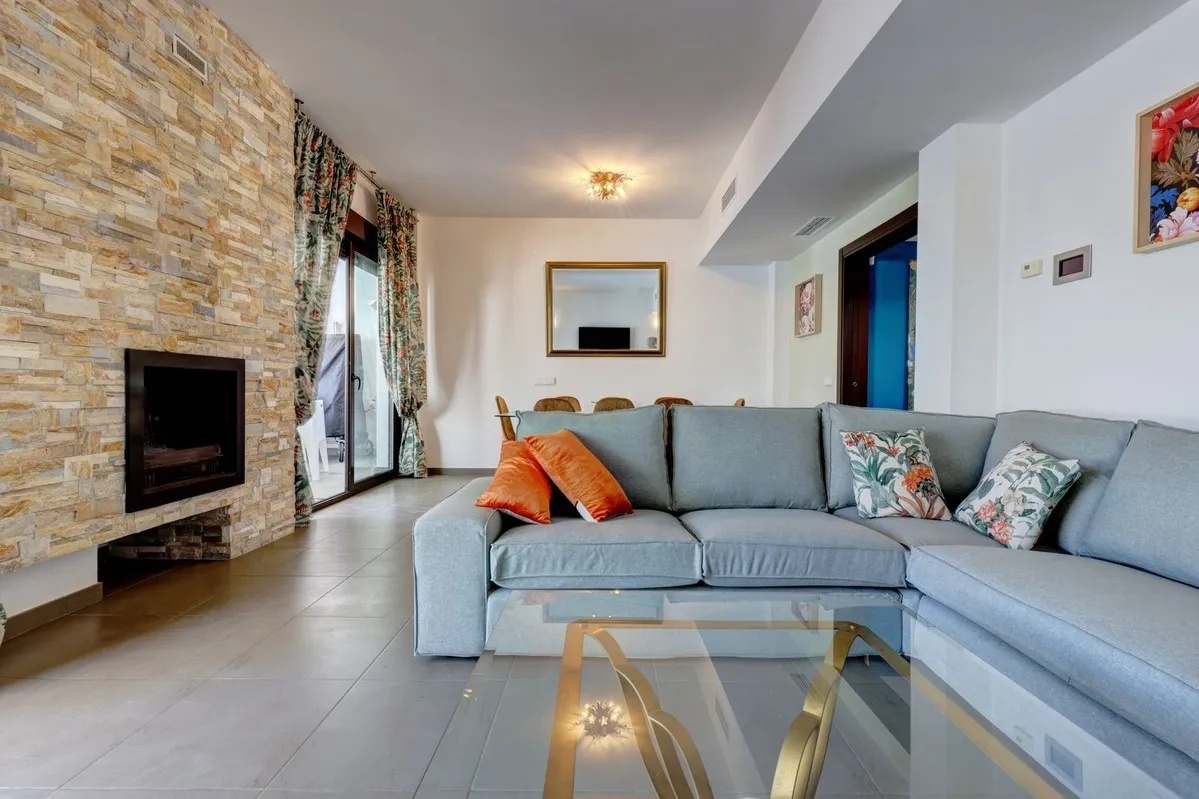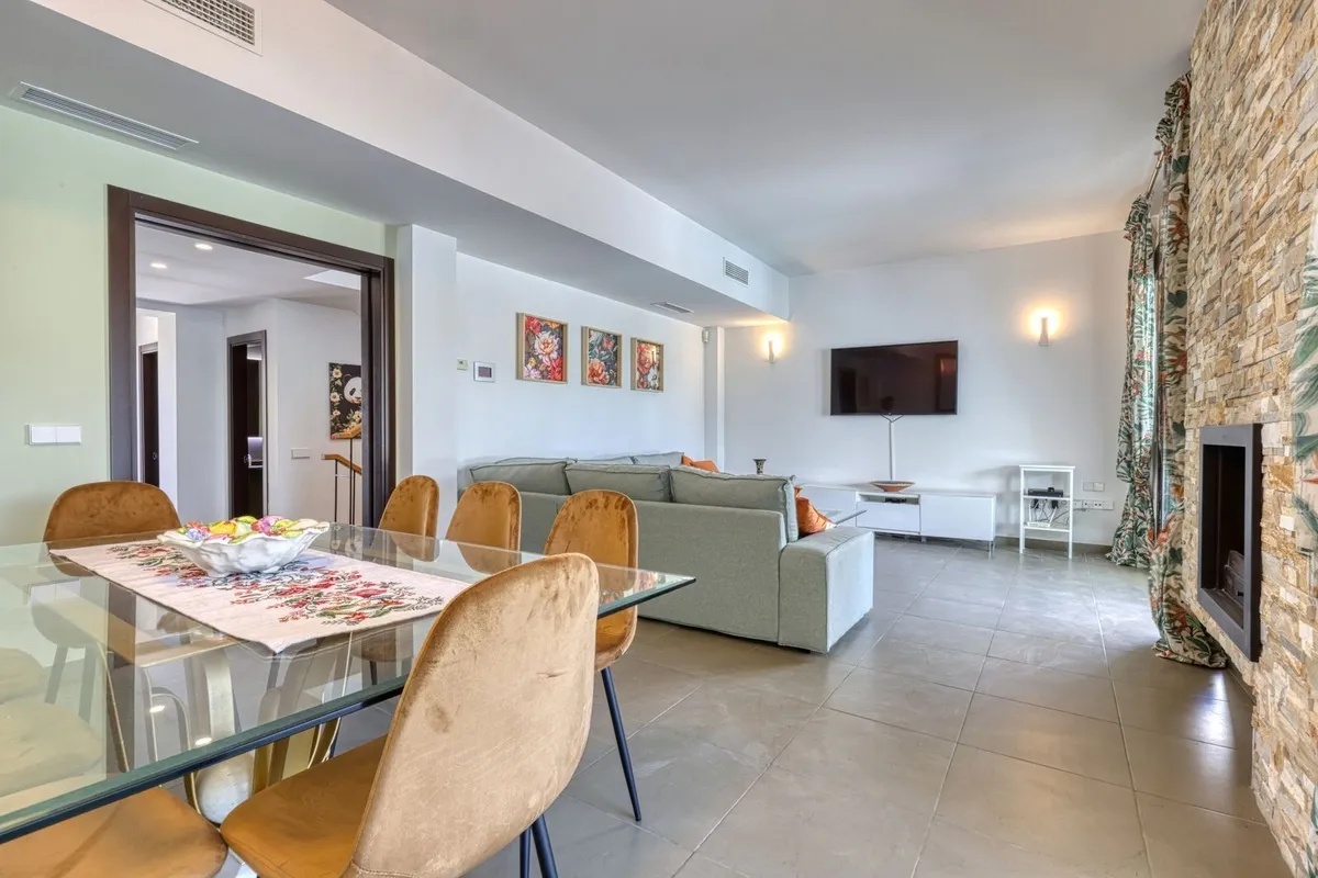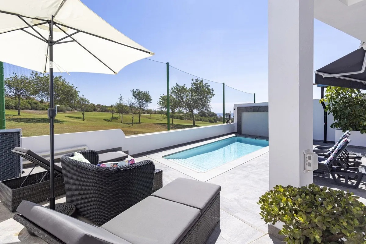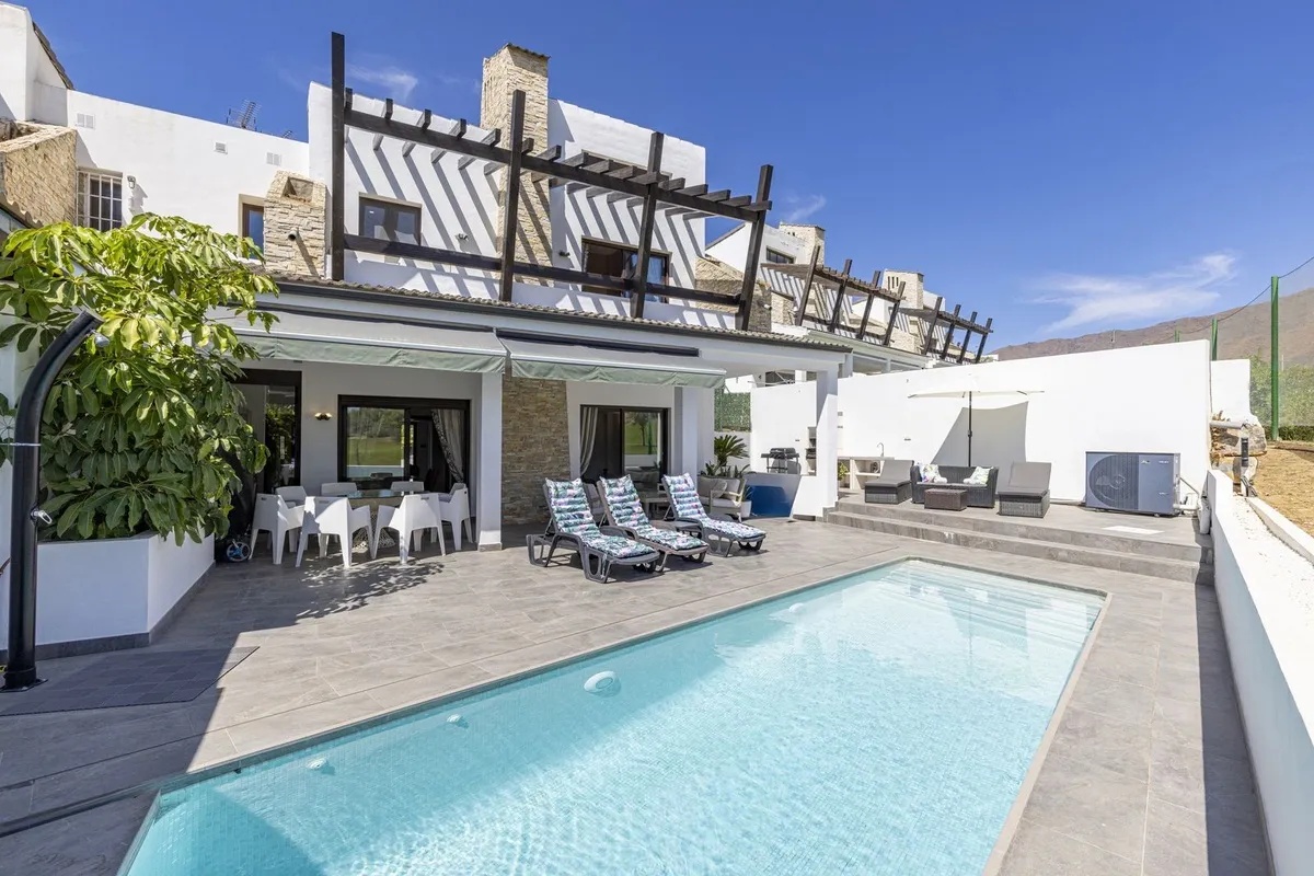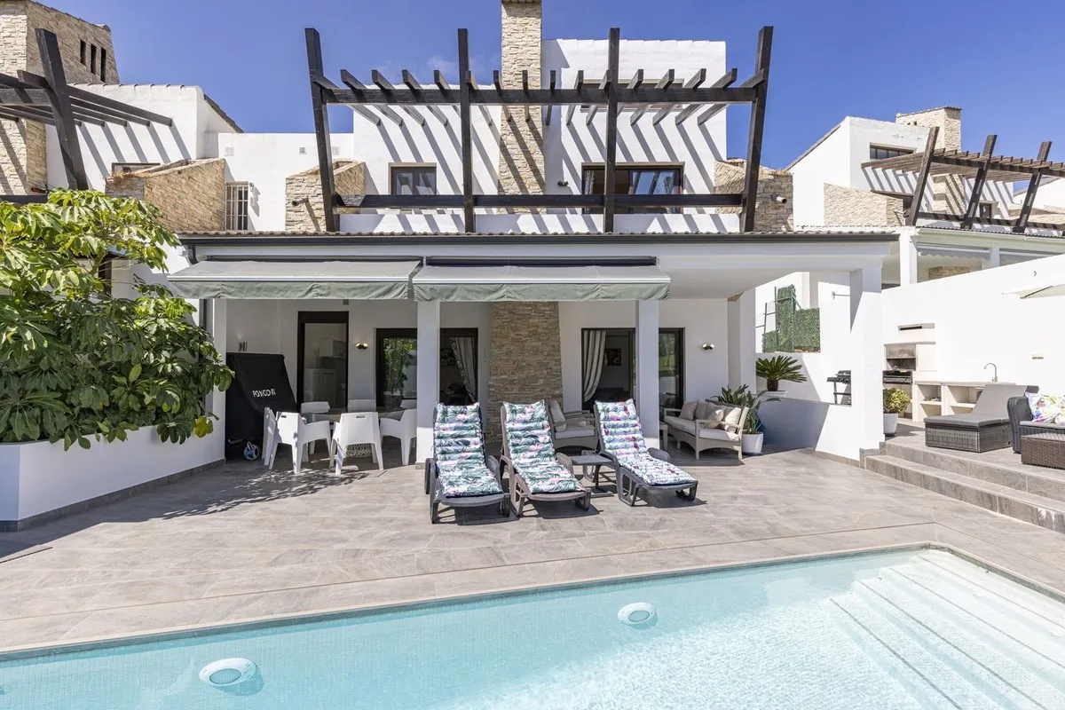 Discover your dream home on the Costa del Sol! This stunning three-story semi-detached villa, located frontline to the Valle Romano Golf Course, offers an exceptional Mediterranean lifestyle. With 4 spacious bedrooms and 3.5 bathrooms, this property comfortably accommodates up to 8 guests — ideal for families or groups of friends.