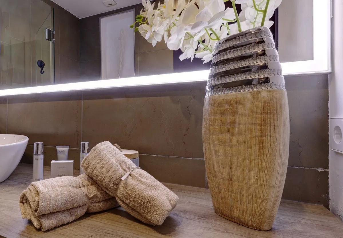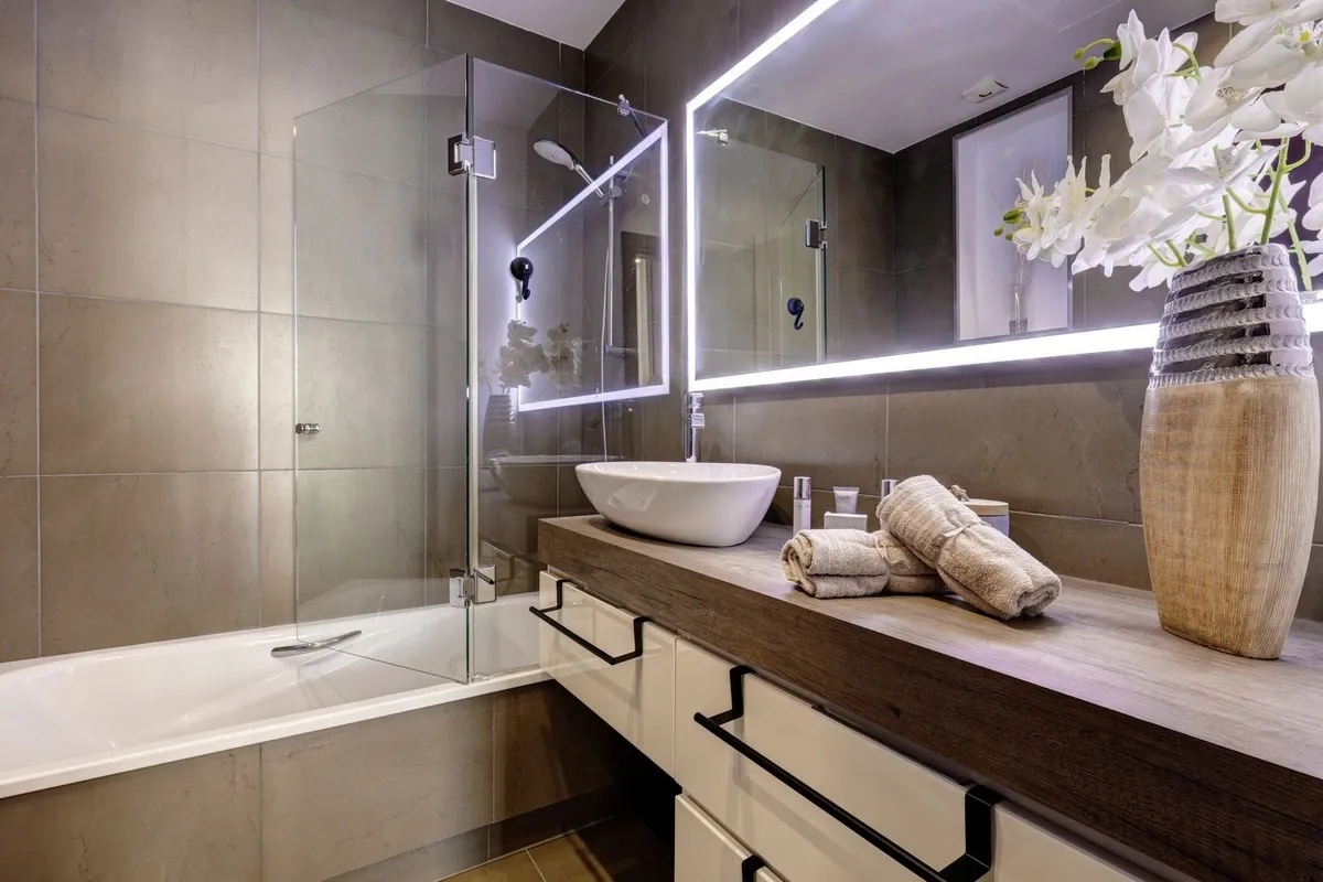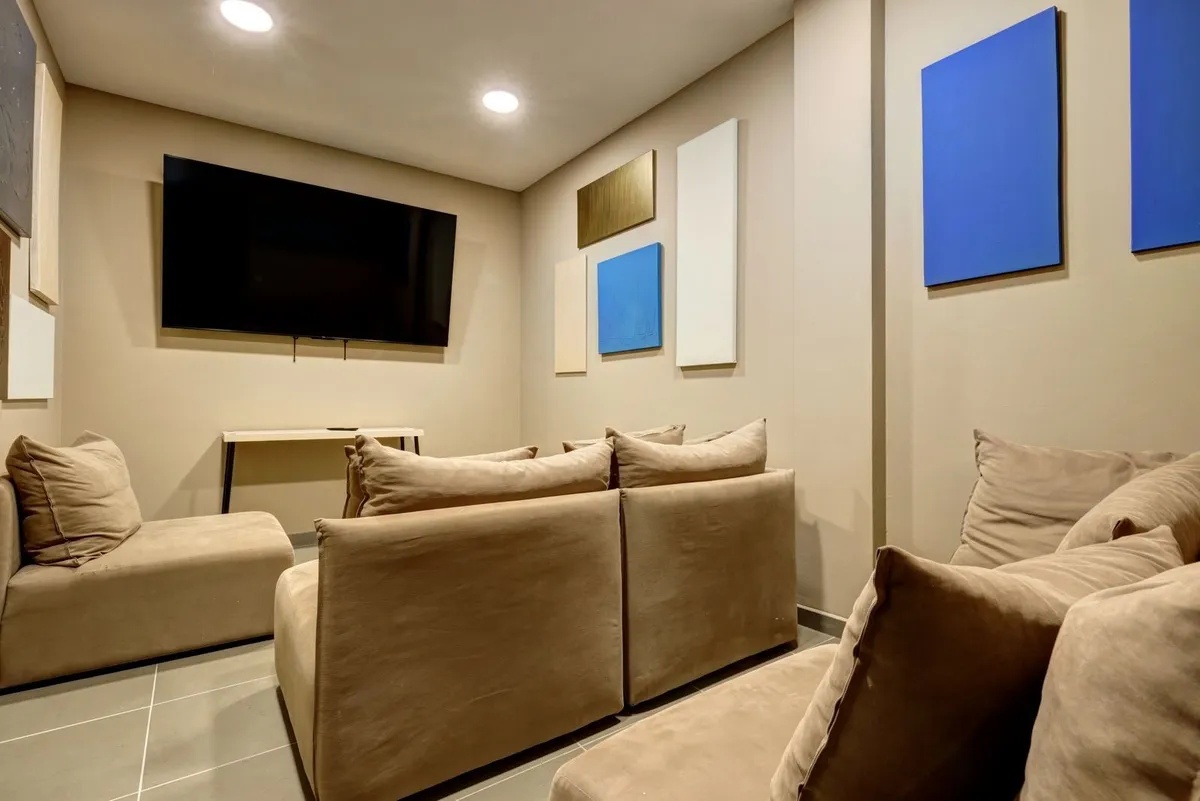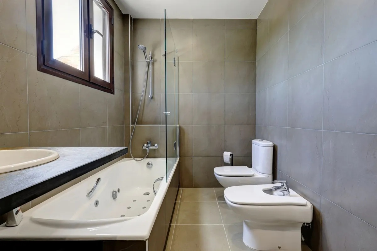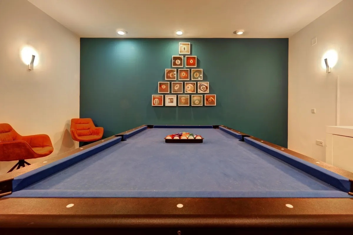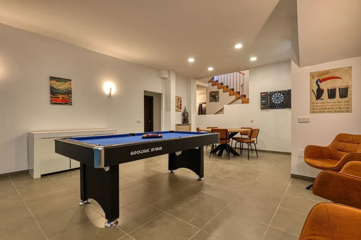 Step outside to your private terrace oasis, complete with a pool, solar shower, outdoor dining area, and barbecue, ideal for making the most of the Mediterranean climate. For fun and entertainment, there’s a games room with pool table and dartboard, and for cozy evenings, a private cinema room with a 75” screen awaits.