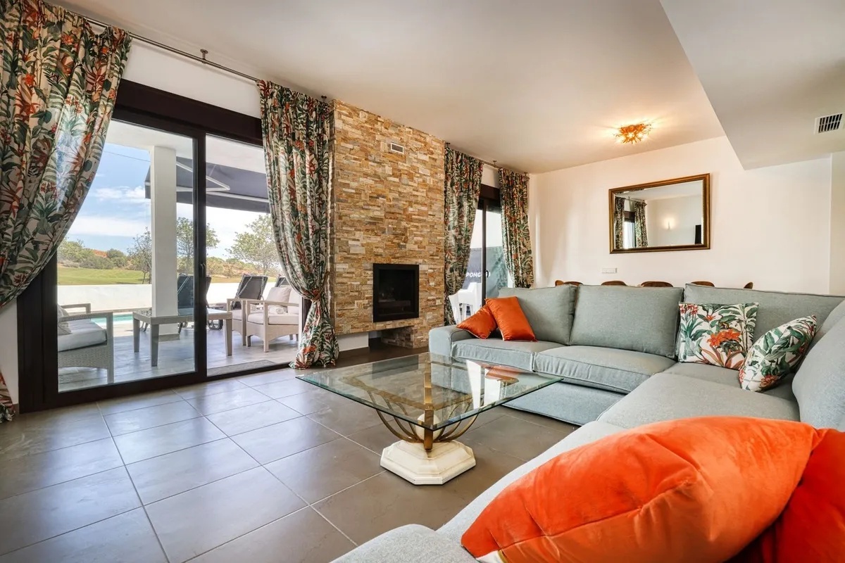The bright and open living room, equipped with a flat-screen TV, is the perfect spot to unwind after a day on the golf course.