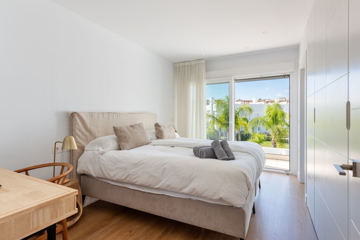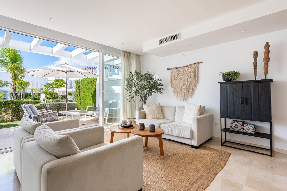 A bright and spacious open-plan living area welcomes you with floor-to-ceiling windows that flood the space with natural light. The living room opens onto a sunny terrace, private garden, and the beautifully landscaped communal gardens and pool.