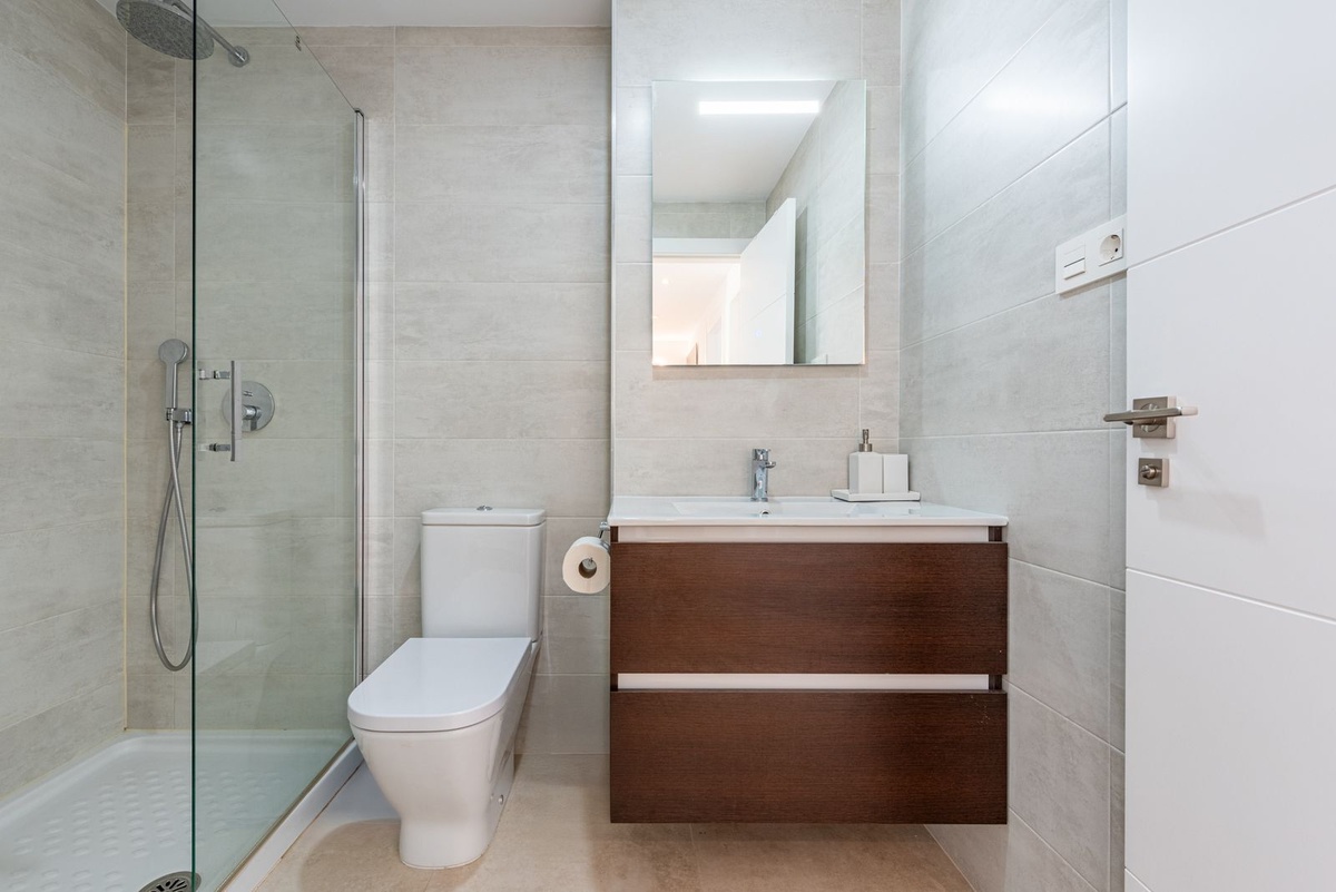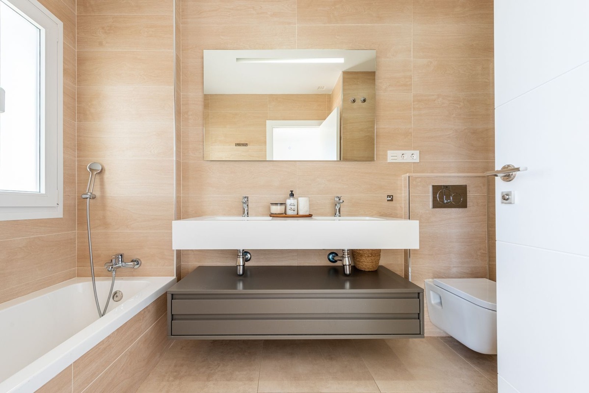 A sleek floating staircase leads to the upper floor, which features three bedrooms and two modern bathrooms—both with underfloor heating. From here, you have direct access to a spectacular solarium with a pergola, perfect for sunbathing, relaxing, or entertaining.