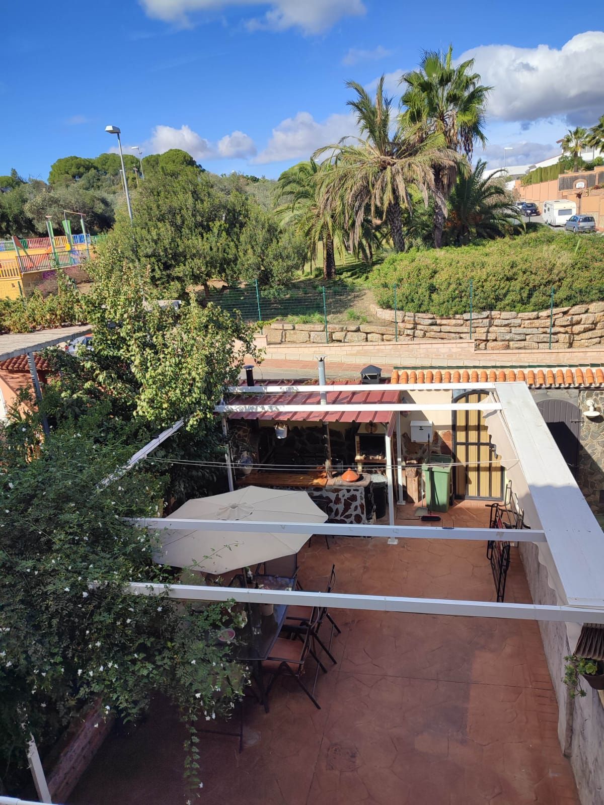 At the back, you’ll find a functional patio with a countertop (including electrical sockets for outdoor cooking), a laundry room with a Junkers butane water heater, a utility sink, and plenty of shelving.