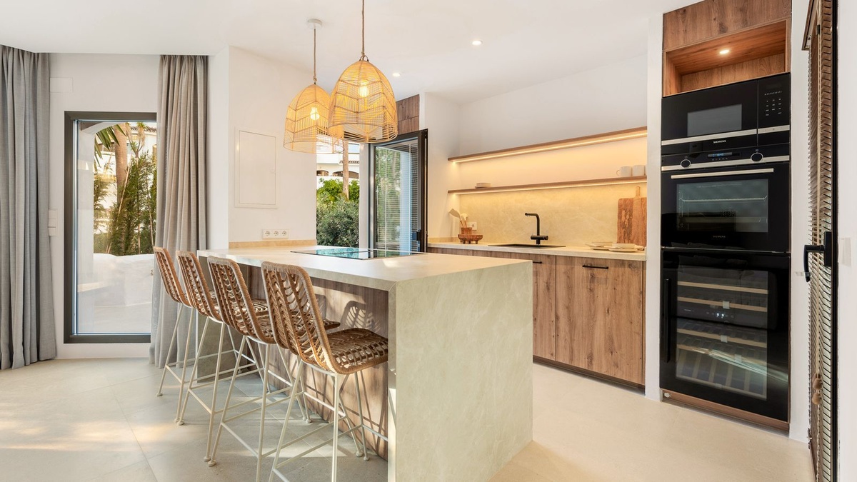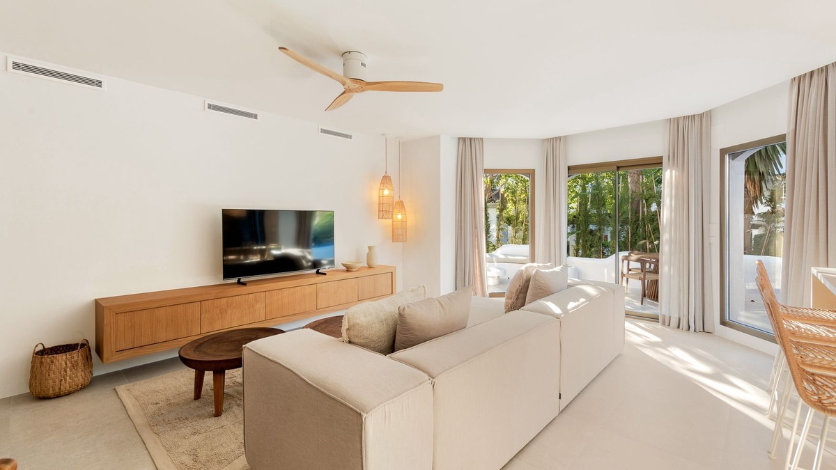 Located within the exclusive beachfront residential enclave of Golden Beach in Elviria, this fully refurbished ground-floor apartment offers the true lifestyle of modern Mediterranean living. Facing west, it enjoys beautiful sunsets, creating a warm and welcoming atmosphere both inside and out on the terrace.