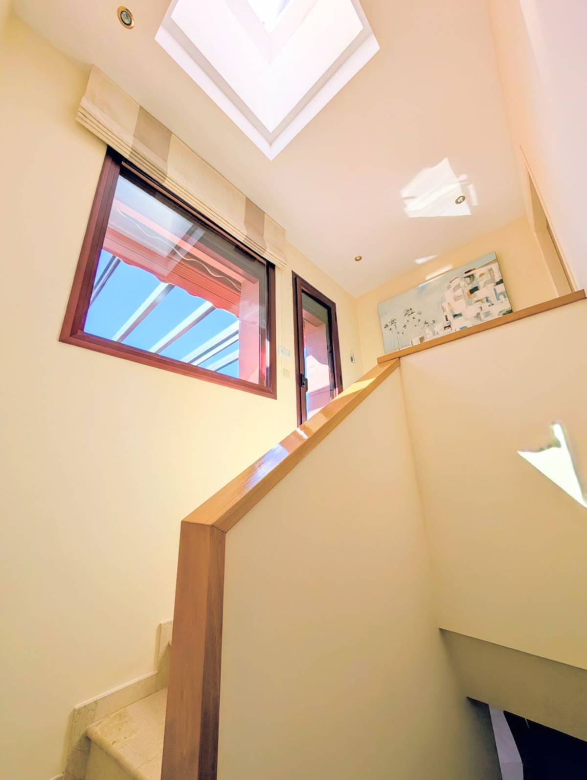 Nice staircase takes to upper level which is entirely occupied by master suite, including the bedroom, bathroom with dressing area and two large terraces, one of these private for master suite and other one has independent access from distribution hall. This amazing sunny terrace comes with sunbathing and sitting areas, BBQ & kitchenette. Absolutely stunning panoramic views and incredible sunsets can be enjoyed from this terrace.