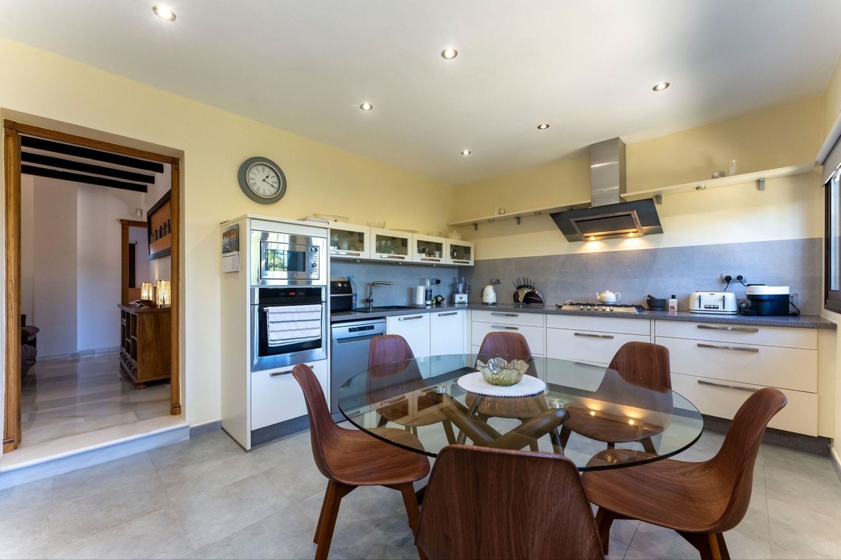 From the living room, sliding doors open onto a glazed terrace, ideal for year-round use, leading directly to the private swimming pool and beautifully maintained garden surrounded by mature vegetation. The plot also includes a utility room, storage hut for garden equipment, and a selection of fruit trees.