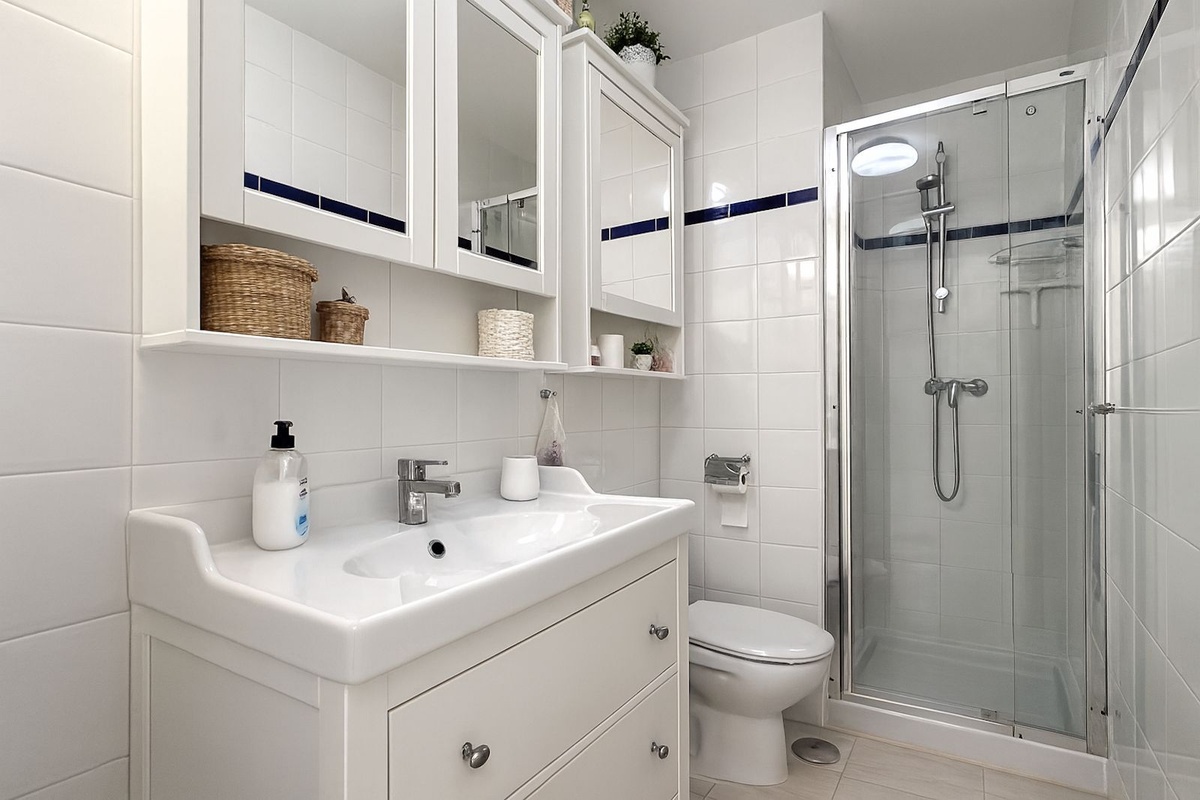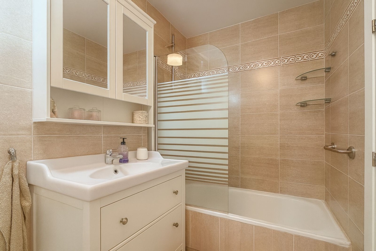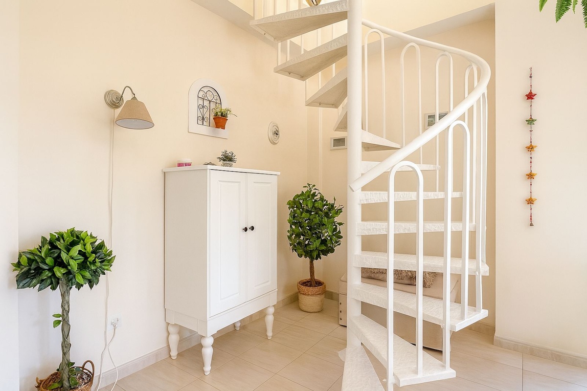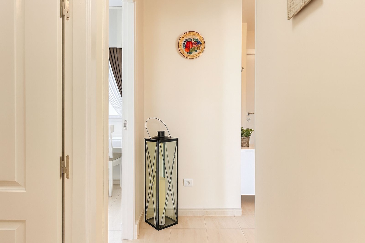 This floor also houses the two bedrooms; the main one, with its own small balcony and en-suite bathroom, and a second bedroom served by an independent second bathroom.