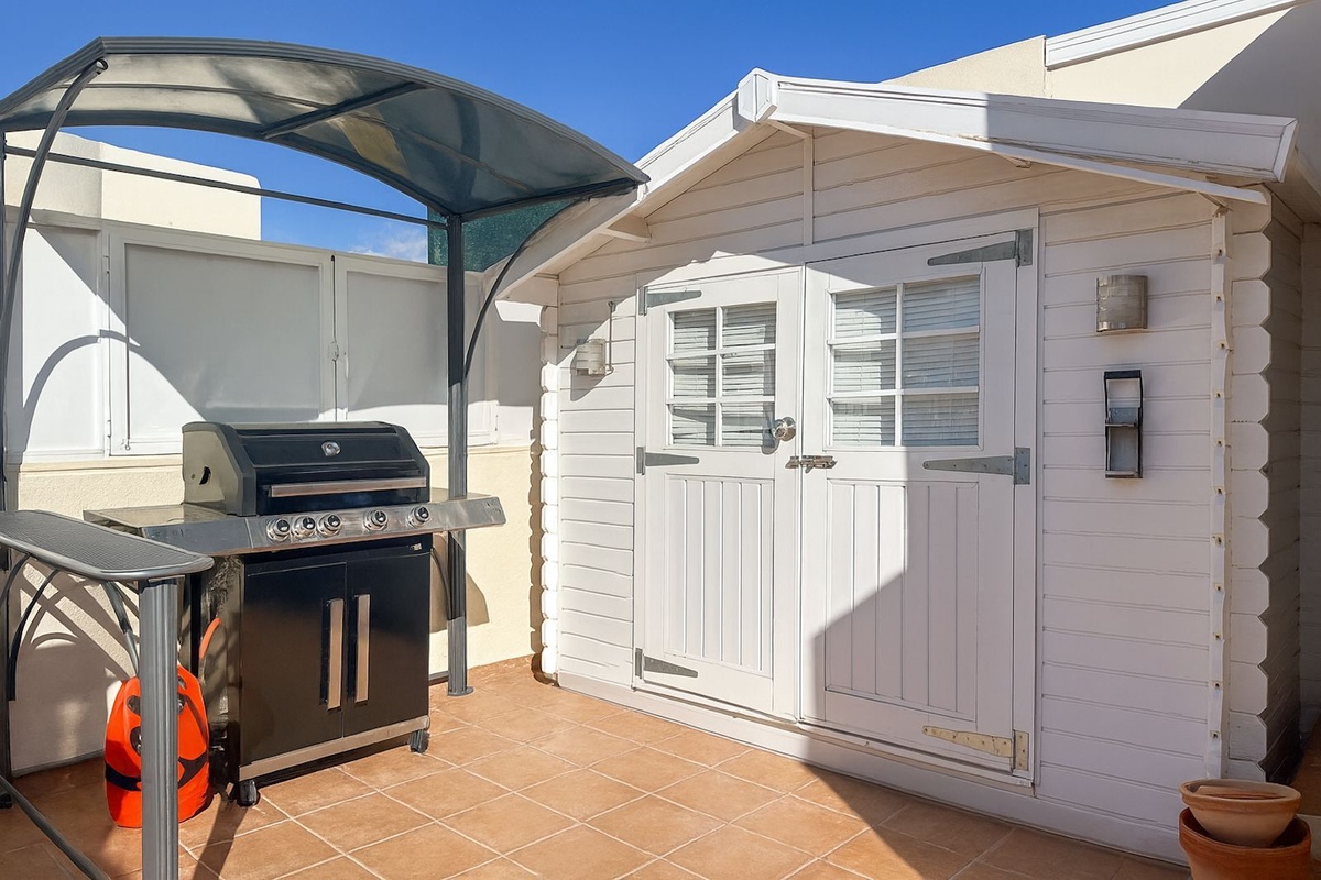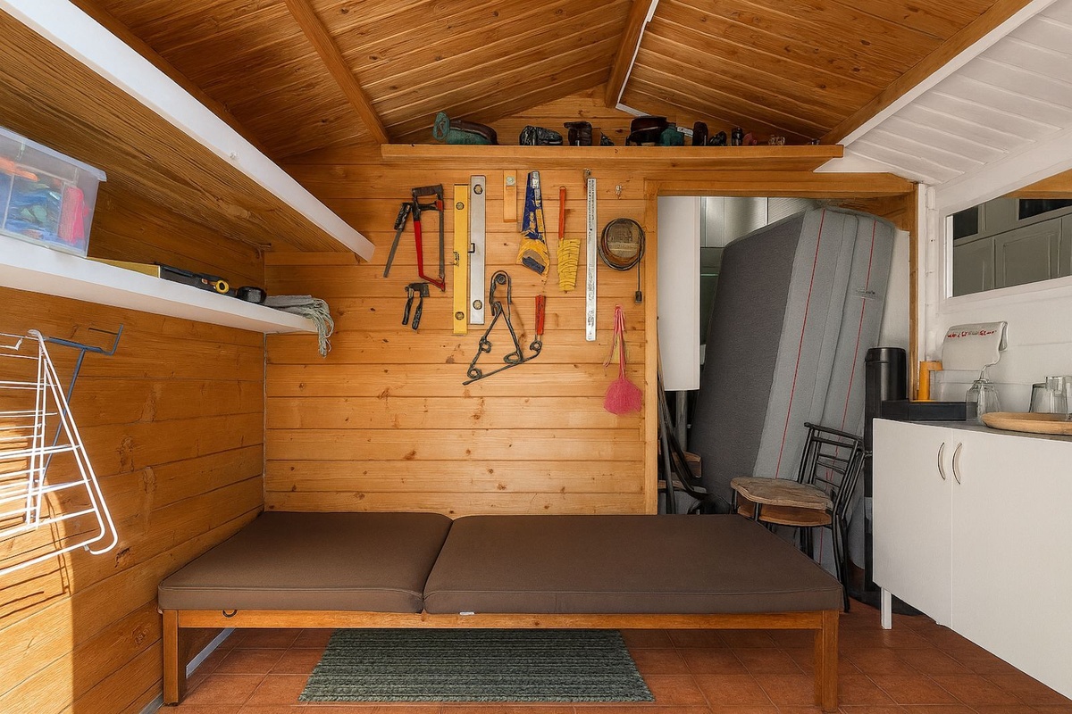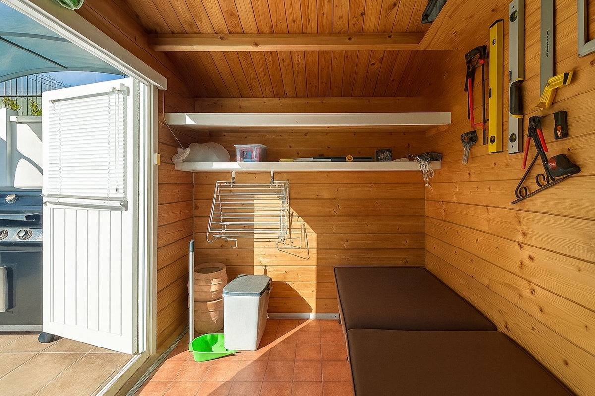Furthermore, the upper terrace includes a small cabin that currently functions as a workshop and storage room, but features a tiny kitchenette, providing the potential to be converted into an independent studio or guest room.