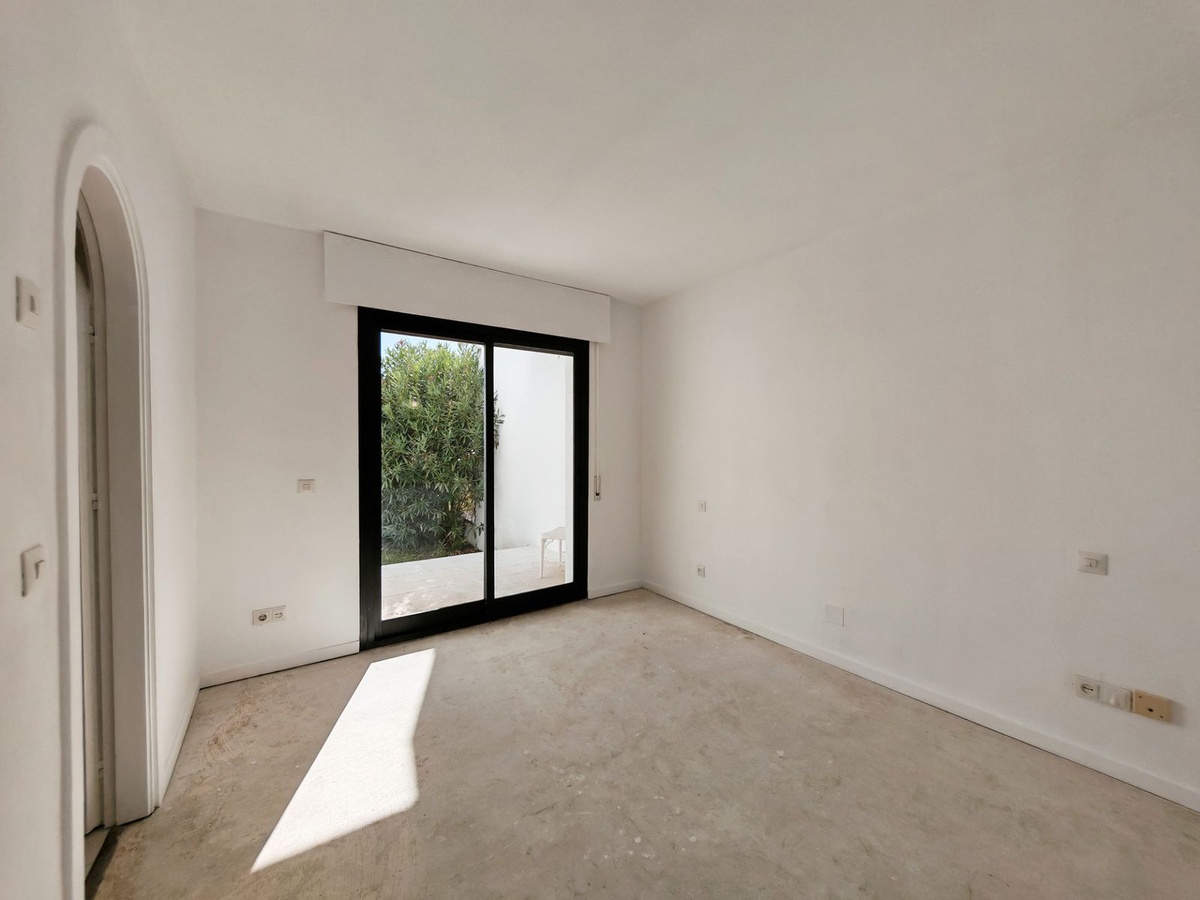Town House for sale in Cabopino, Marbella with 2 bedrooms, 2 bathrooms, 2 en suite bathrooms and 1 toilet, with communal swimming pool and private garden. Regarding property dimensions, it has 123 m² built, 175 m² plot and 30 m² terrace. Has the following facilities amenities near, air conditioning, fireplace, guest toilet, private terrace, sea view, covered terrace, panoramic view, unfurnished, close to sea / beach, close to golf, uncovered terrace, glass doors, balcony, renovation needed and close to shops.