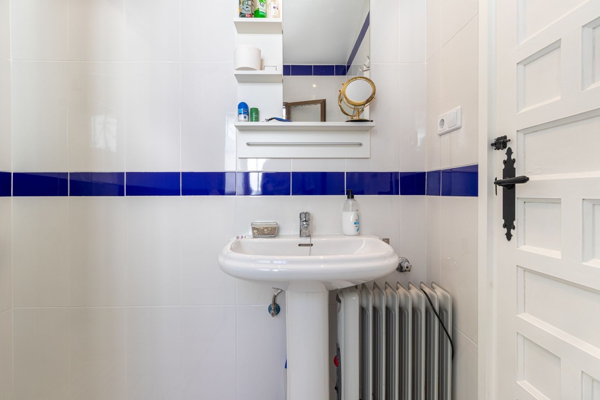 As you arrive at the house, you feel the tranquility of the urbanization, a haven of peace and serenity. The main entrance welcomes you with a staircase that leads us down, transitioning from a ground floor to a middle floor, designated as -1. Here we find two cozy bedrooms with built-in wardrobes made of original wood, preserving the traditional character of the area. One of the bedrooms is equipped with a surveillance control center, as the property features a sophisticated camera system to ensure your security and provide peace of mind, even when you're away.