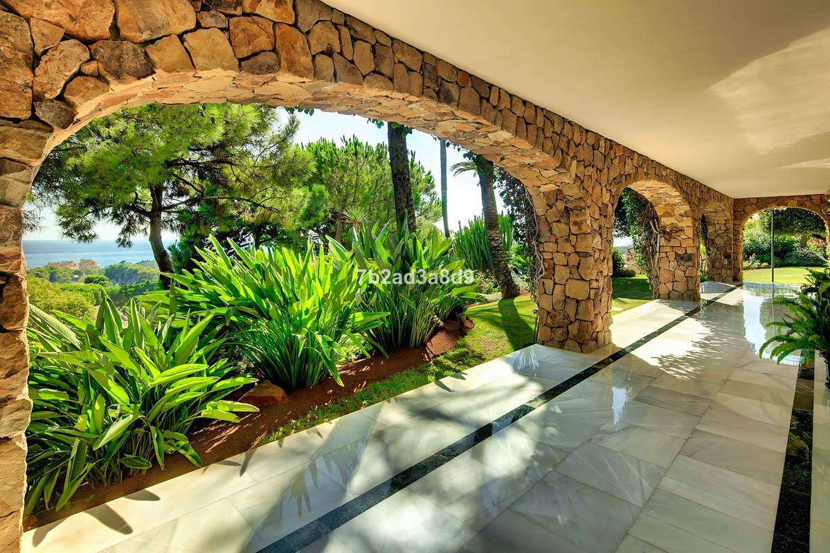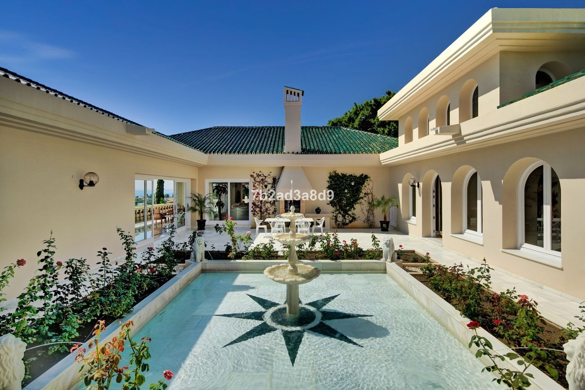 The property currently features ten bedrooms and ten bathrooms arranged within a timeless layout, complemented by multiple lounges, expansive terraces, and a pavilion ideal for wellness, entertaining, or a retreat-style bar. The main house includes a traditional central patio with a fountain, generous living and dining areas, and suites with direct access to the terraces and pool. A separate two-storey guest house offers additional bedrooms, lounges, and kitchen facilities, making it perfect for extended family or visitors. The estate further benefits from a four-car garage, beautifully landscaped gardens, and an impressive pool area designed to capture the spectacular sea and golf views.