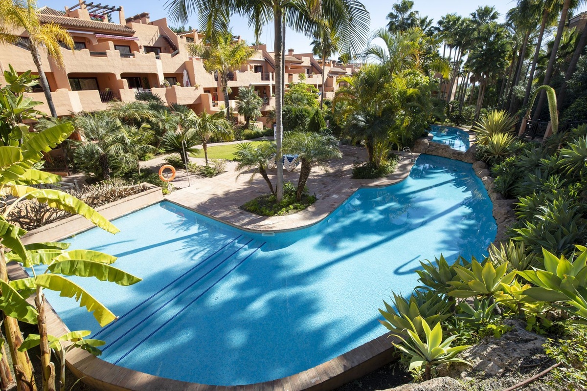 This lovely complex situated next to the wonderful Los Flamingos golf course is a perfect location for a holiday home or rental investment. With shops and restaurants just a 2 minute drive away, Albaicin complex boasts tropical gardens and a unique pool area. The apartment situated on the 1st floor is bright and airy with great views to the pool and gardens. Large living area with a terrace from the living room and mater bedroom. Fully equipped kitchen, hallway with storage area. 2 large bedrooms with master offering a walk in closet and en suite bathroom. Bedroom 2 also has a small terrace and plenty of cupboard space. with bathroom next door. The elevator takes you directly to the garage where you also have a storeroom. This is a great opportunity to live in a luxury development in between Marbella and Estepona.