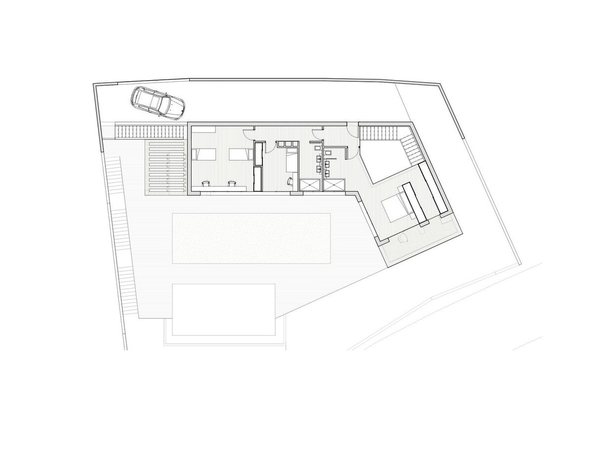 The projected dwelling is modern and functional, with two levels arranged around a side patio that provides illumination and ventilation.