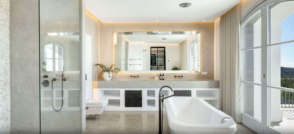 Upstairs, the master suite impresses with a bespoke dressing room and a luxurious marble bathroom, featuring a sculptural bathtub with panoramic views of the sea and Gibraltar. Two additional bedrooms and a fully appointed bathroom complete this level, ensuring comfort and privacy throughout.