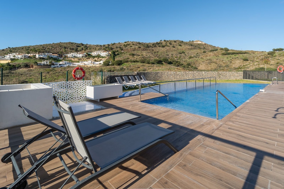 Stylish communal swimming pool overlooking the sea