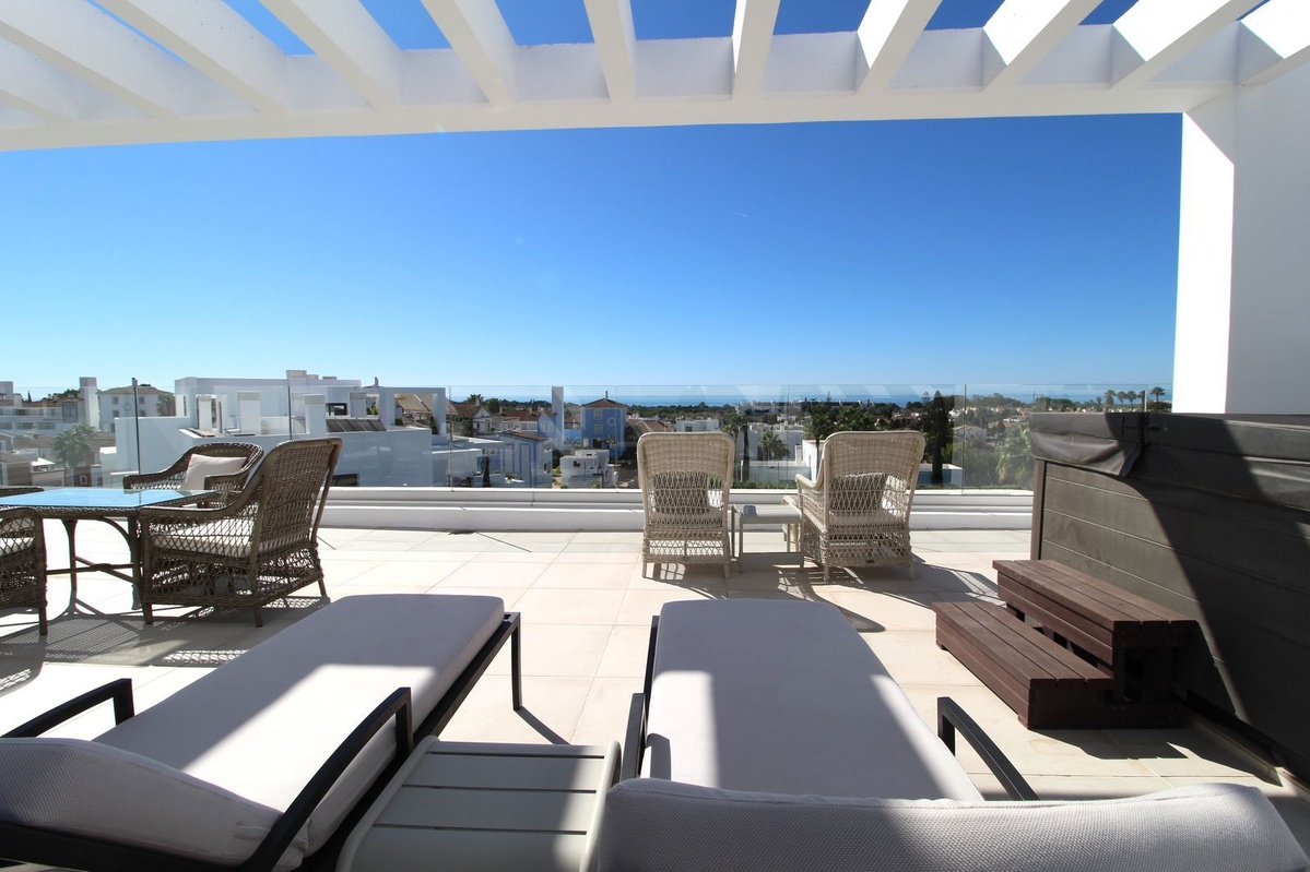 Set in a peaceful yet convenient location, just a nine-minute stroll from a choice of restaurants, bars and supermarkets, this exceptional three-bedroom south-facing penthouse enjoys sweeping Mediterranean views from almost every room and from its expansive terraces.