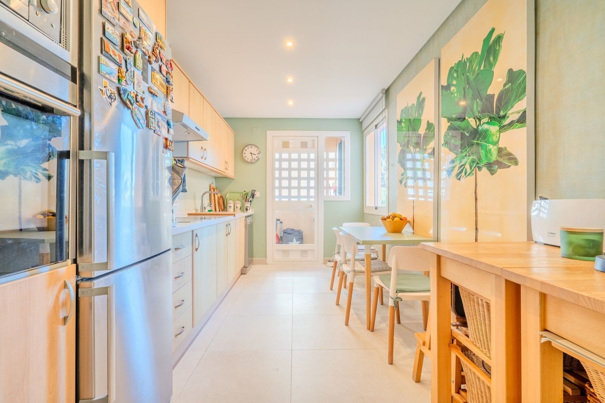 The separate kitchen is fully equipped and includes a utility room. There are three well-sized bedrooms, two of which are en suite. The master bedroom features built-in wardrobes and direct access to the terrace. The second bedroom is very bright, benefiting from large windows and morning sun, while the third bedroom also has a small private terrace.