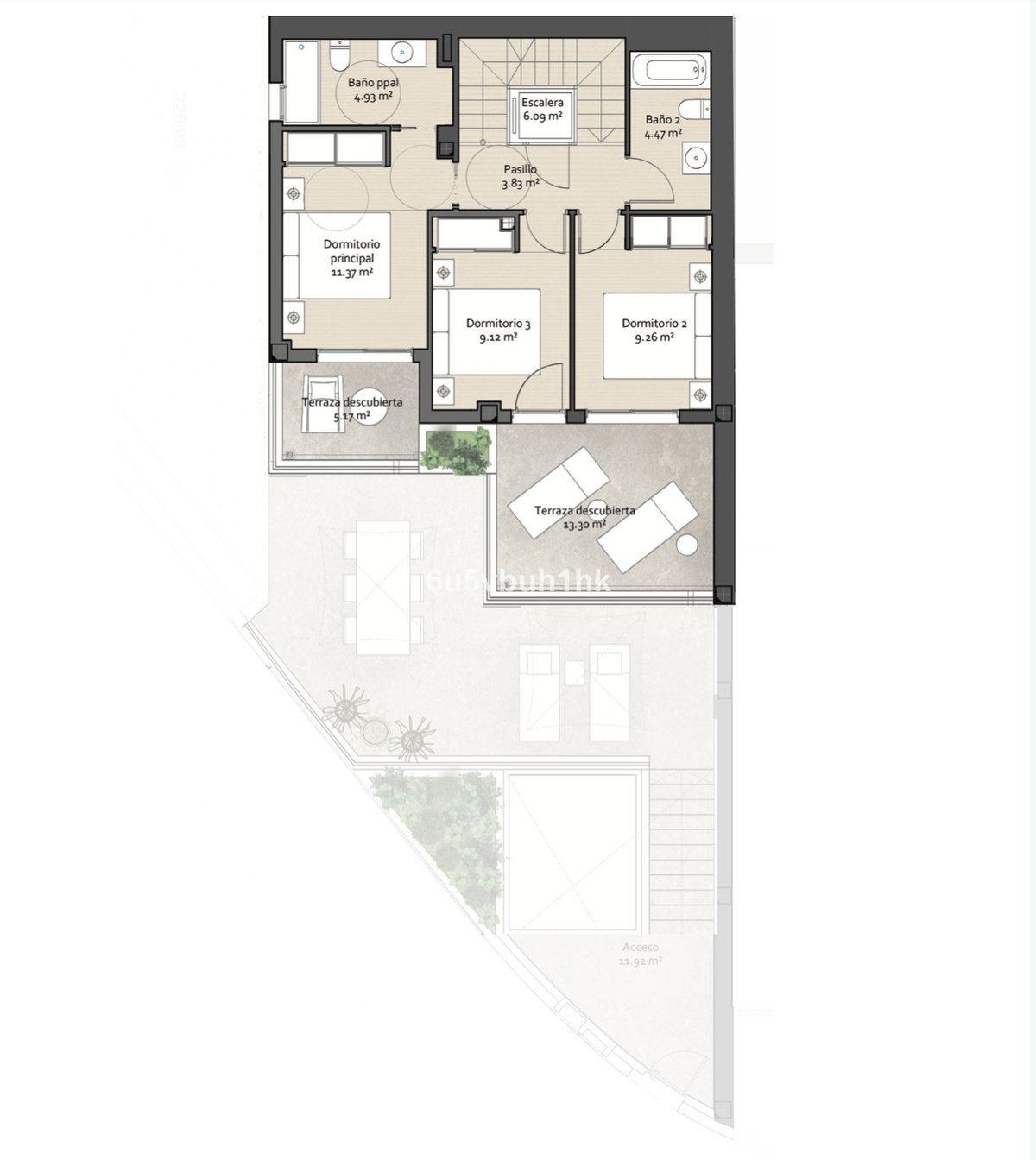 The upper level hosts three bedrooms and two bathrooms. The master bedroom includes an en-suite bathroom, and all bedrooms have direct access to a terrace with stunning sea views, flooding the rooms with natural light.