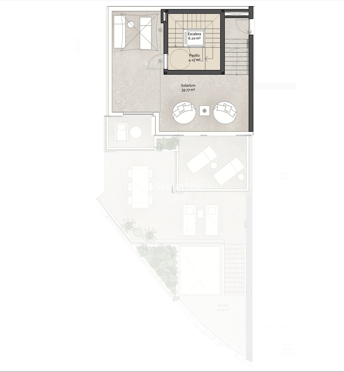 The private 40 m² rooftop solarium offers a unique space to unwind, with direct access to the communal swimming pool and pre-installation for a jacuzzi, making it ideal for enjoying sunsets and outdoor living.