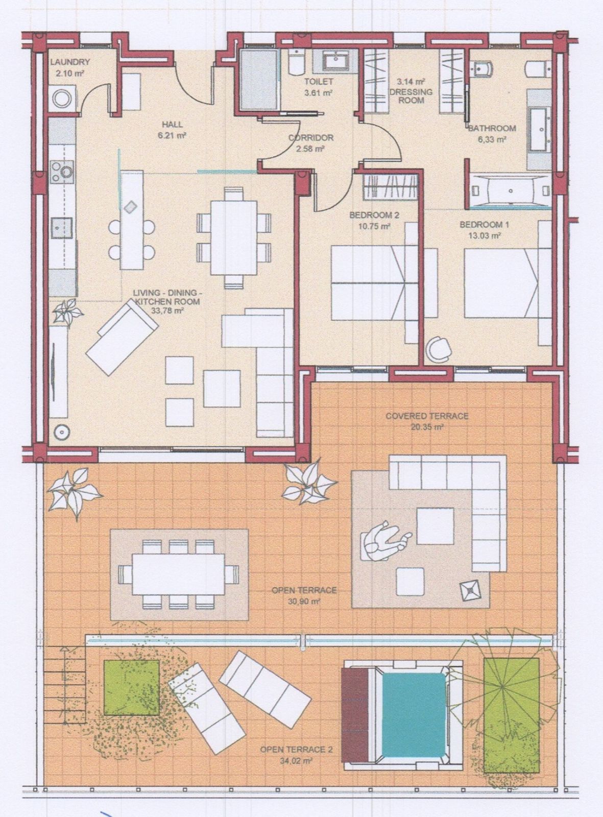 Spacious living with open plan kitchen and laundry area, sunny large terrace in two levels with hot tub.
