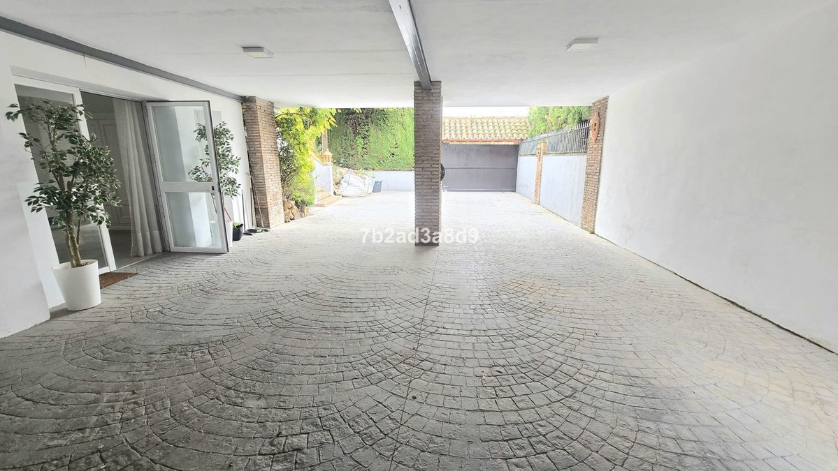 Outdoors, the villa boasts a heated swimming pool, perfect for year-round enjoyment of Marbella’s exceptional climate. Parking is plentiful, with capacity for up to six vehicles, including a two-car garage, a covered carport for two cars, and two additional uncovered spaces within the plot.
