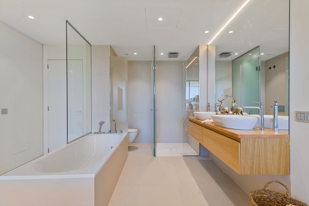The master bedroom is exclusively designed as a private sanctuary, featuring a freestanding bathtub and direct access to the expansive terrace. It’s a space created for slow mornings and quiet evenings, where indoor comfort blends effortlessly with the outdoor surroundings.