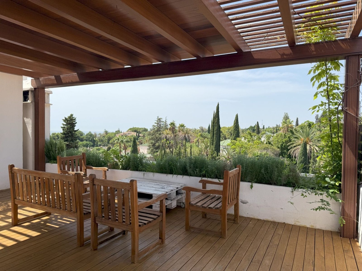 The outdoor spaces are a particular highlight, with a total of 66m² comprising a 16m² terrace and a 50m² solarium, offering panoramic views over tropical gardens and charming traditional building surroundings, down to the Mediterranean Sea. The penthouse also boasts a roof top solarium terrace, providing options for relaxation and enjoyment throughout the year. Additional features include underfloor heating and air conditioning with independent controls in each room, security entrance, and lift access.