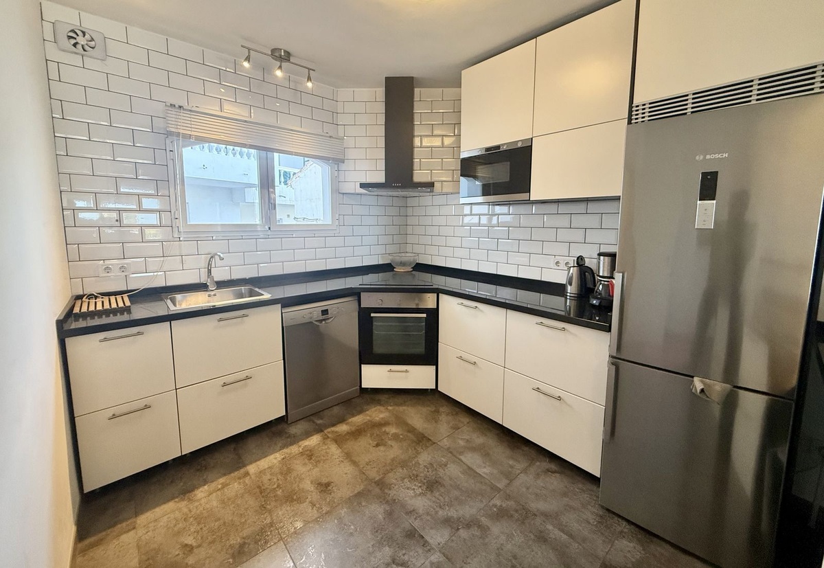 The main house is laid out over two levels. On the entrance floor there are two bedrooms, one double and one twin, plus a bathroom with shower. Upstairs, a staircase leads to a living room opening onto a balcony with sea views, a fully equipped open-plan kitchen, and a second bathroom. From the balcony, a spiral staircase leads up to the property’s standout feature: a solarium of almost 40 m² with outdoor kitchen and BBQ, perfect for relaxing, sunbathing, or enjoying evening drinks.