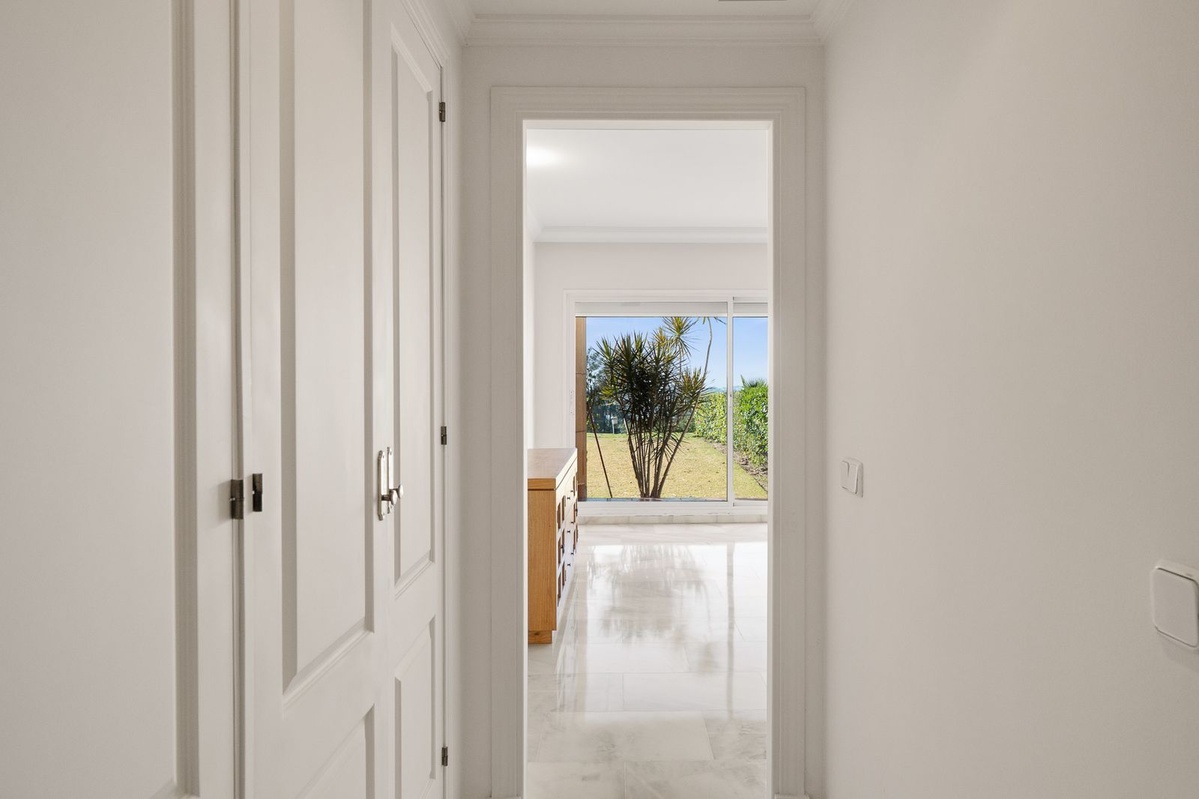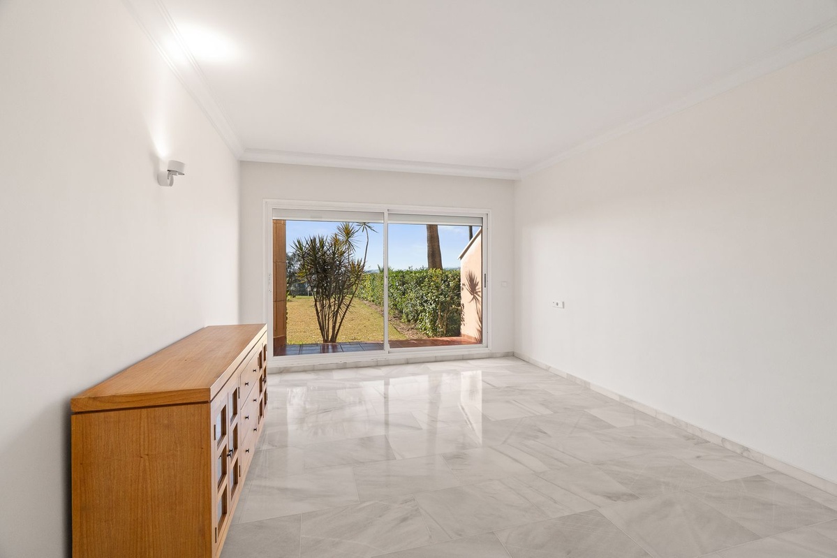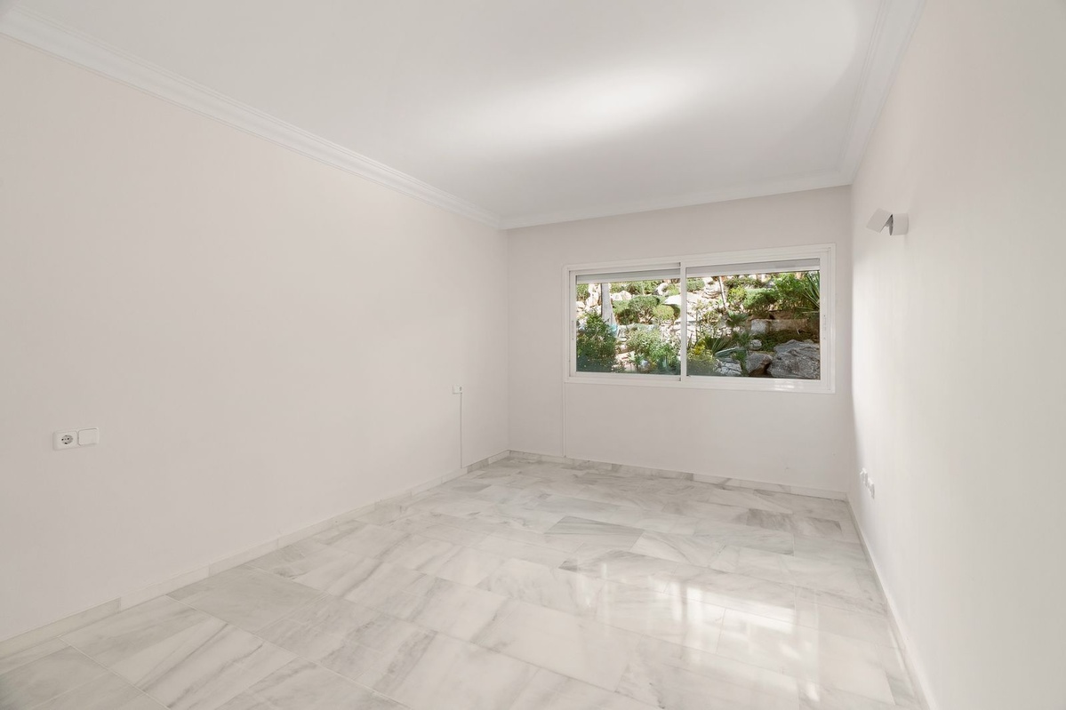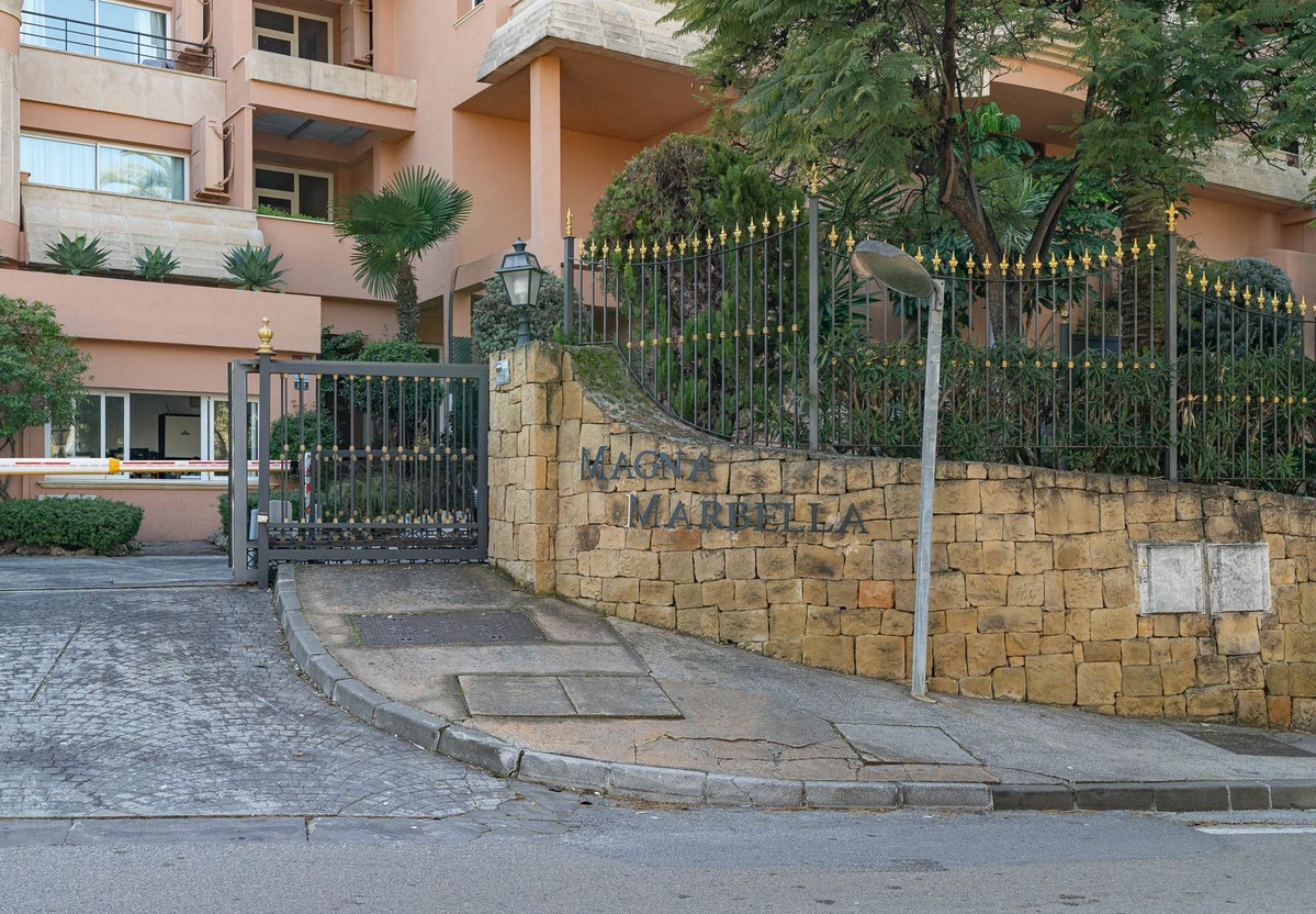 Two-bedroom apartment in the Magna Marbella development in Nueva Andalucia. The apartment is available and equipped with basic new furniture. The apartment consists of two bedrooms, two bathrooms, a kitchen, and a large living room with access to the garden. Located on the golf course, the garden offers mountain and sea views. Does the property include one underground parking space? The development has 24-hour security.