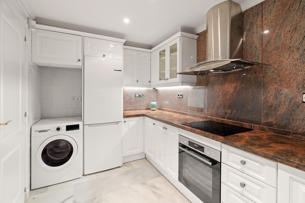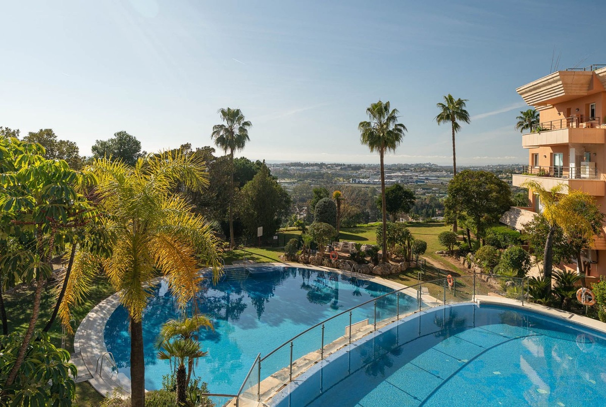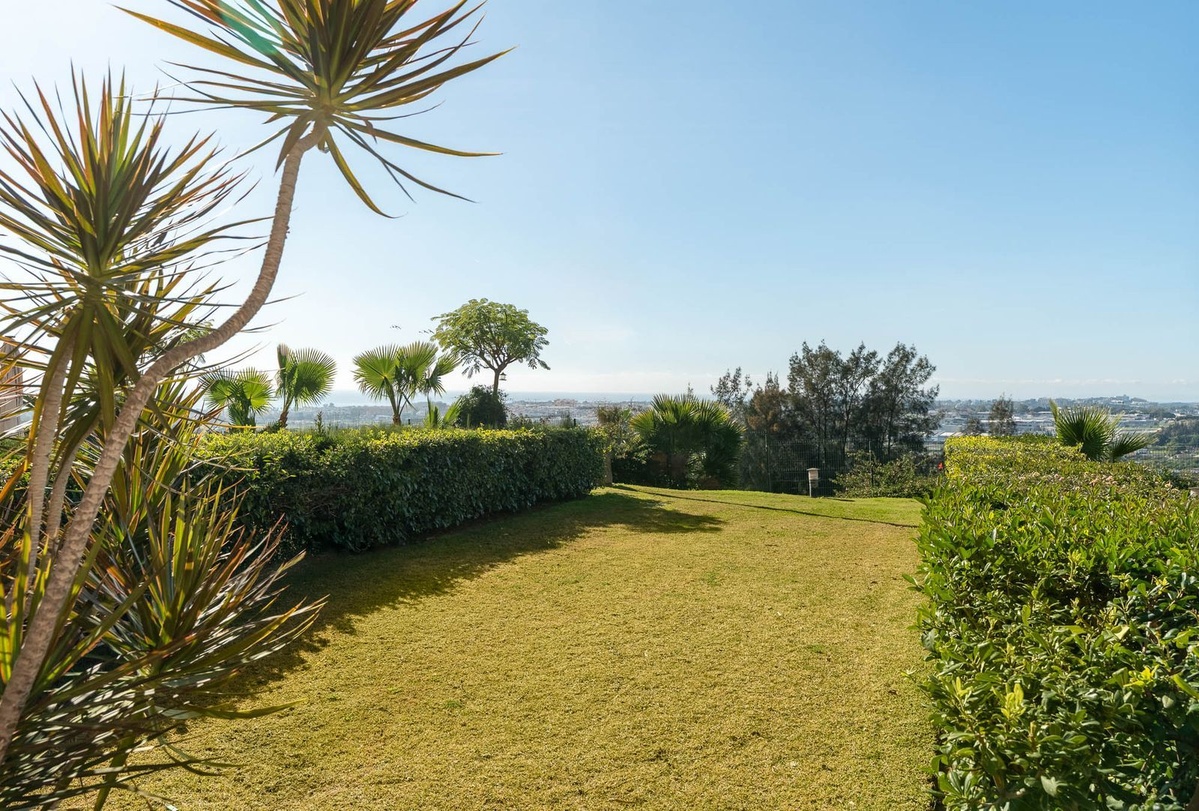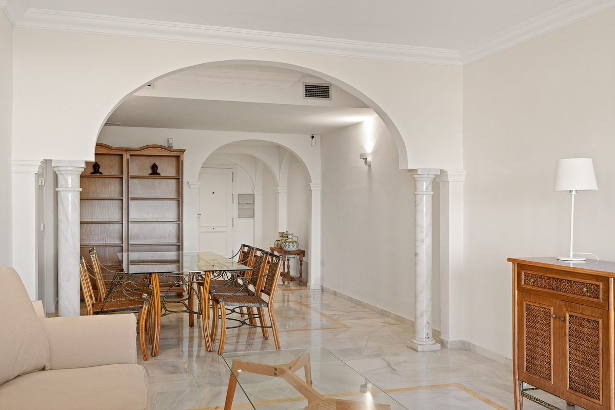 Two-bedroom apartment in the Magna Marbella development in Nueva Andalucia. The apartment is available and equipped with basic new furniture. The apartment consists of two bedrooms, two bathrooms, a kitchen, and a large living room with access to the garden. Located on the golf course, the garden offers mountain and sea views. Does the property include one underground parking space? The development has 24-hour security.
