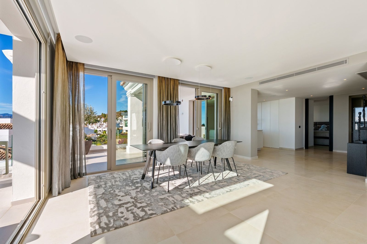 This exceptional duplex penthouse is located within the exclusive gated community of 9 Lions in Aloha, one of the most prestigious residential developments in Nueva Andalucía. Set in an elevated position, the property enjoys panoramic open views across the surrounding greenery, mountains, and toward the Mediterranean. The community is renowned for its contemporary architecture, privacy, and resort-style facilities, including landscaped gardens, multiple swimming pools, spa, gym, and 24-hour security.