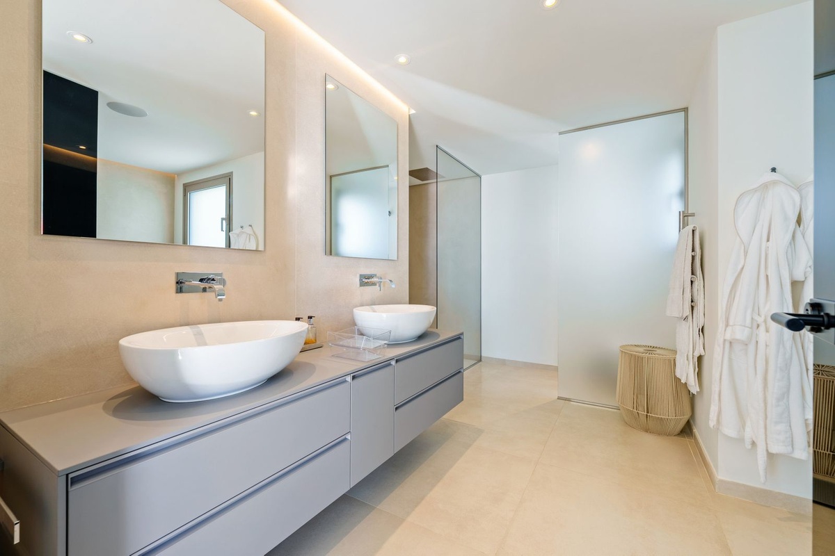 The upper level of the duplex is dedicated to a secondary lounge and private outdoor living. This floor opens onto generous terraces arranged with multiple seating areas, sun loungers, and outdoor dining spaces, ideal for year-round use. The elevated position ensures uninterrupted views and excellent privacy, making the upper terraces a key feature of the property. Additional interior spaces on this level provide flexibility for relaxation, entertainment, or guest use.