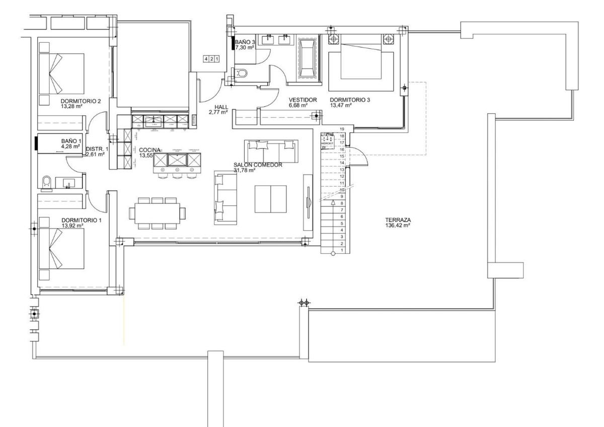 The spectacular 149 m² panoramic main terrace wraps around the living space, offering panoramic Mediterranean views and a breathtaking setting for both intimate evenings and sophisticated entertaining. Here, panoramic scenery becomes part of daily life, sunrise reflections over the sea, golden afternoons, and endless horizon lines. The south-facing orientation ensures sunlight throughout the day and unforgettable sunsets over the coastline. The penthouse enjoys an elevated position with uninterrupted views across Málaga, Mijas and Marbella, extending over the Mediterranean toward Africa. The Andalusian mountains frame the horizon, creating a rare balance between coastline and landscape. The perspective is open, expansive and enduring.