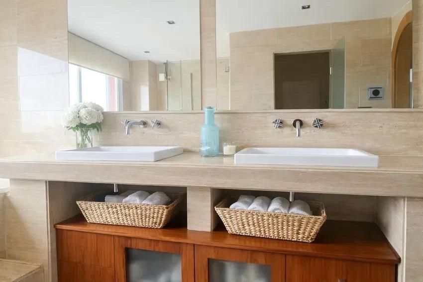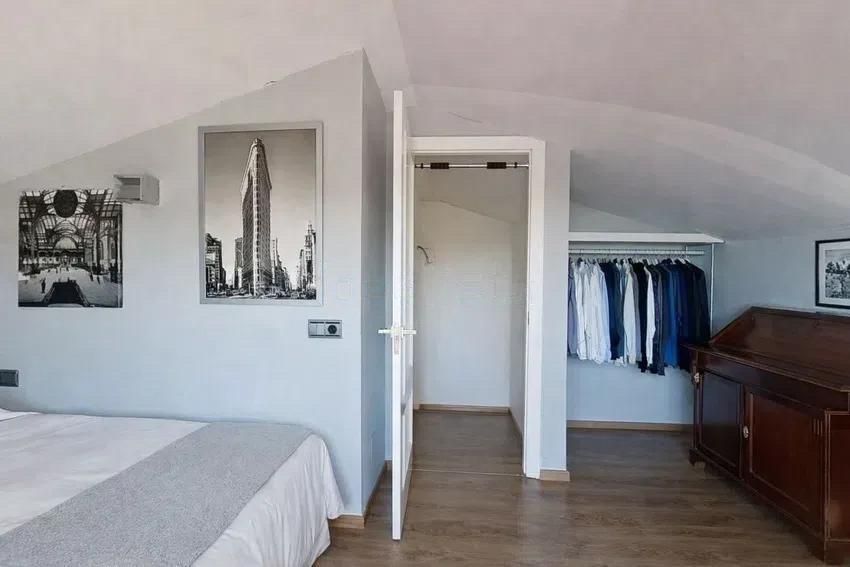 On the first floor, there is a large double bedroom with a walk-in closet and sitting area, along with a full bathroom with a shower cabin, all enjoying spectacular views. There is also another double bedroom, currently used as an office, with built-in wardrobes and its own en-suite bathroom.