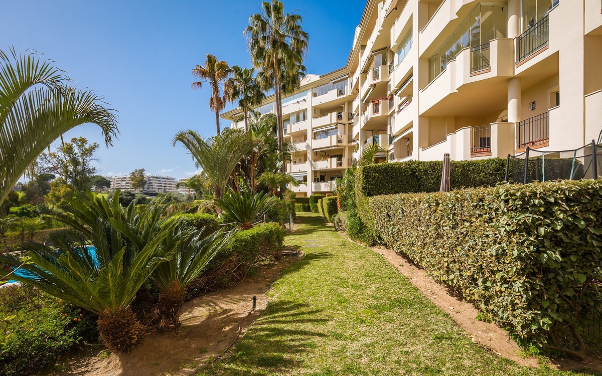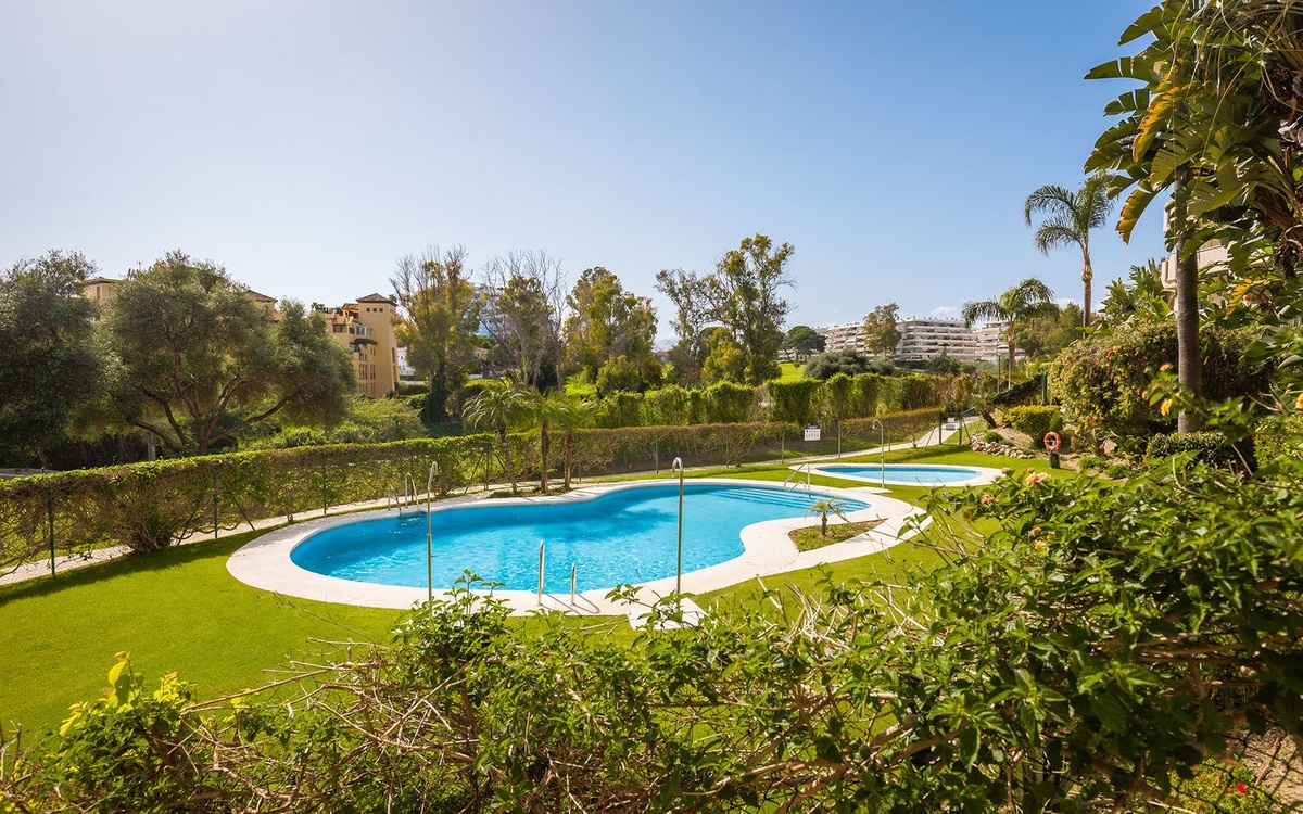 The apartment offers approximately 165 m² built area, distributed into two spacious bedrooms and two full bathrooms, making it ideal both as a permanent residence and as a comfortable holiday home. The private garden connects directly to the communal gardens and pool area, allowing easy access to the community facilities while maintaining privacy. Additional features include central air conditioning with heating, fitted wardrobes and a private garage space.