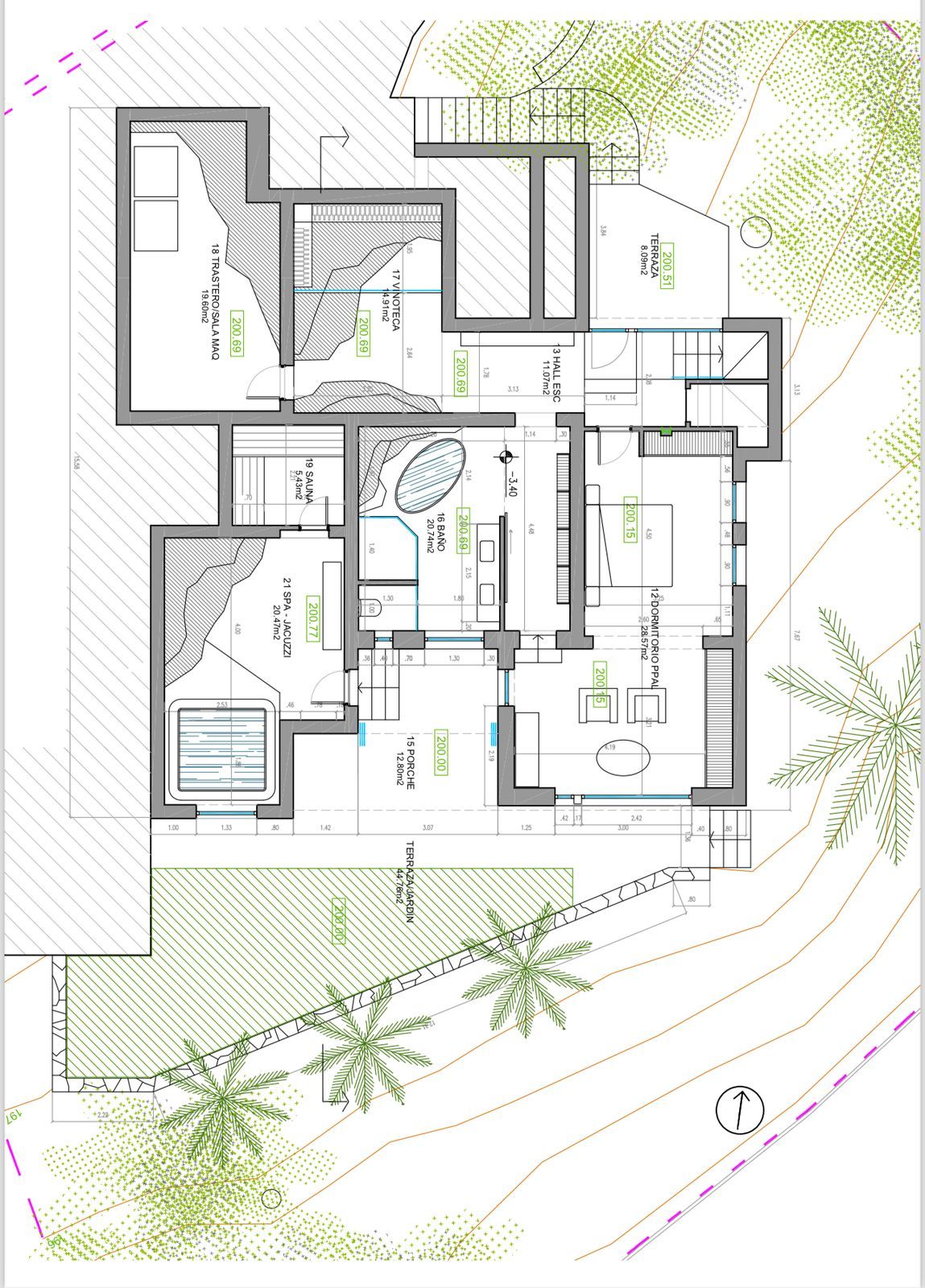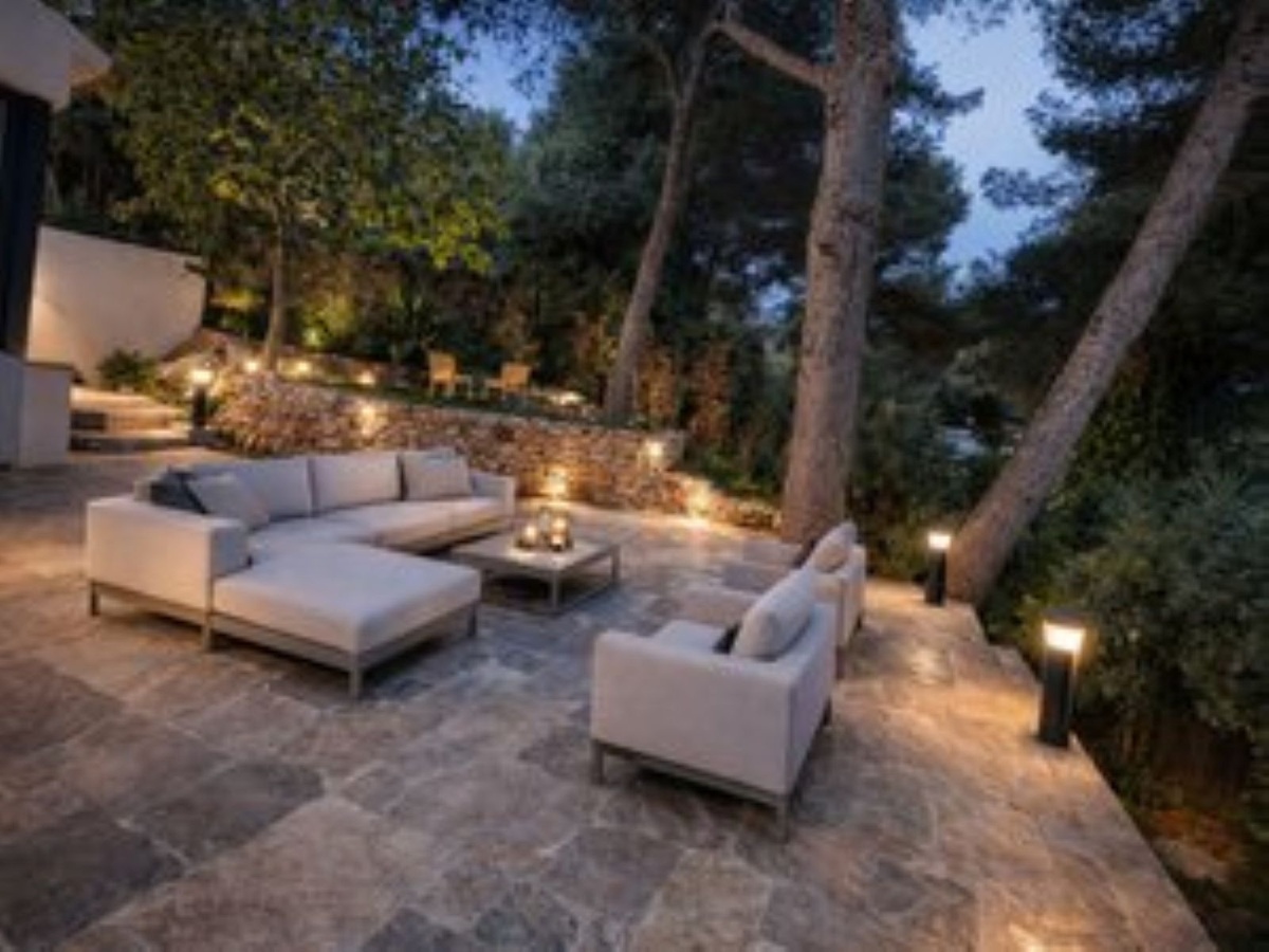 árboles y plantas. Hay varios espacios al aire libre, incluida una gran terraza con