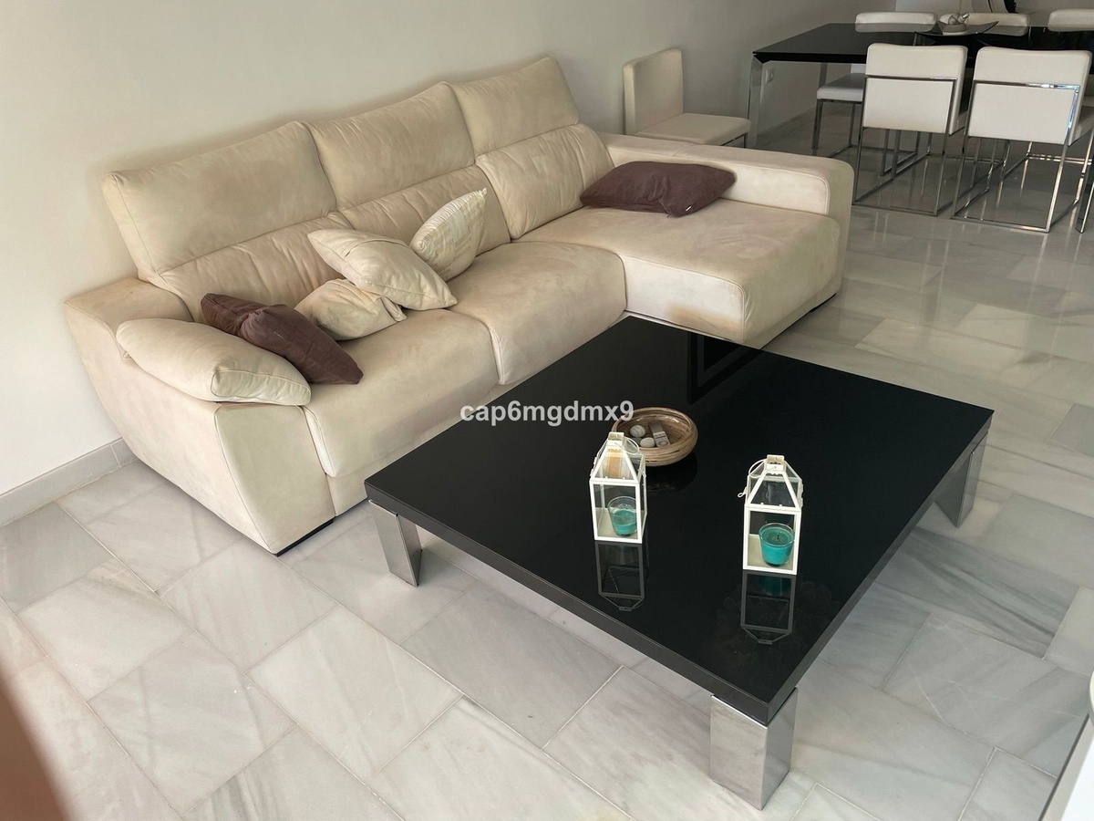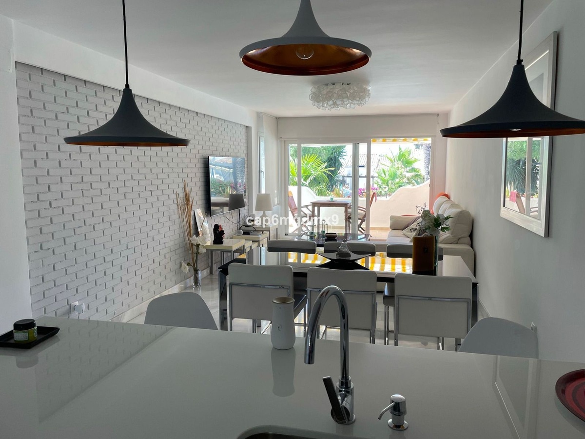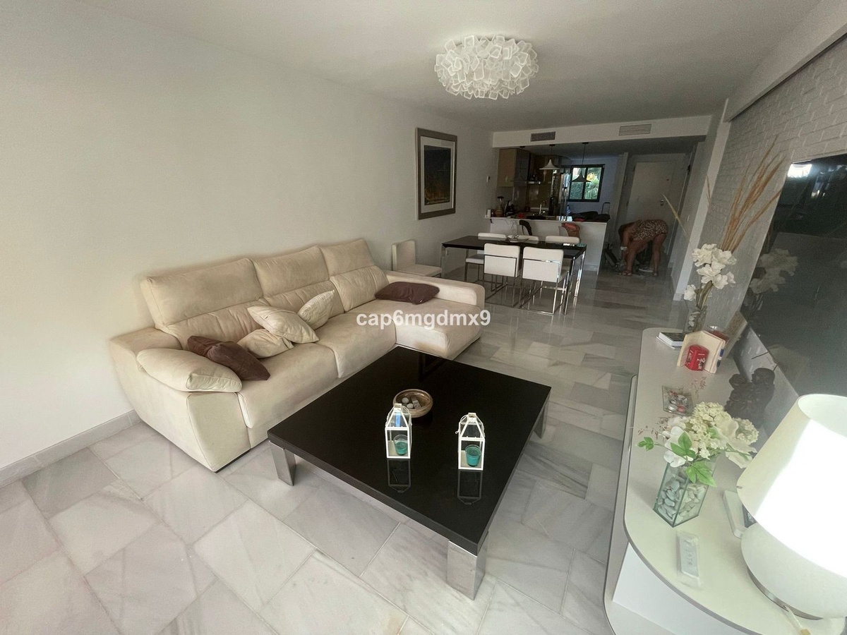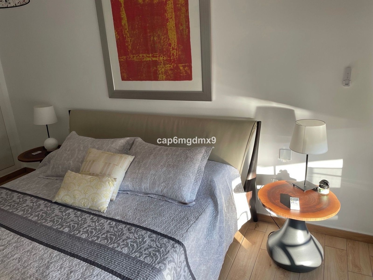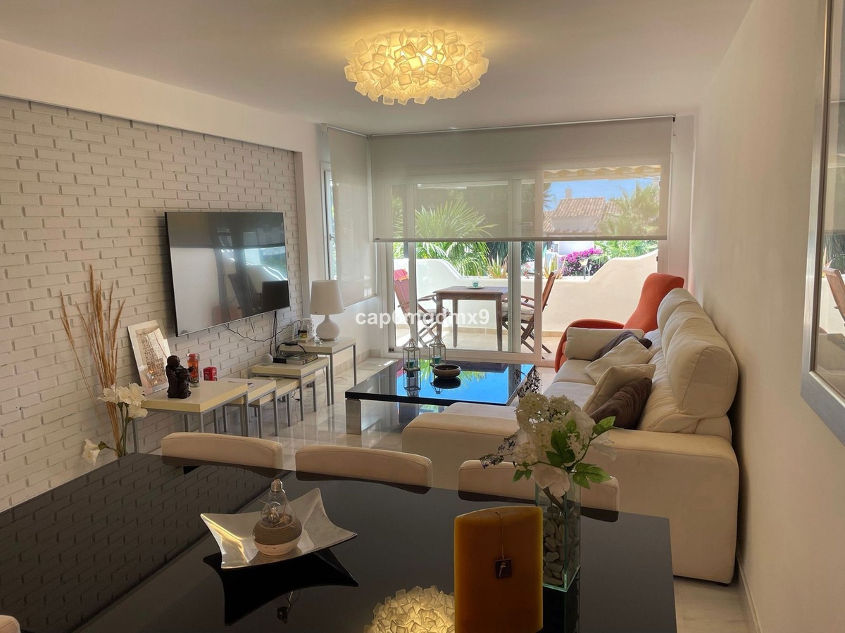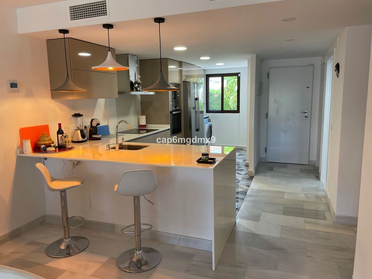 2 bedroom renovated apartment located in Sierra Blanca only a few minutes drive to Marbella. The apartment is on the first floor with one flight of stairs leading up to the property. There is no elevator. The complex is gated and quiet, Spanish style with communal gardens and swimming pool. There is communal parking (not gated).