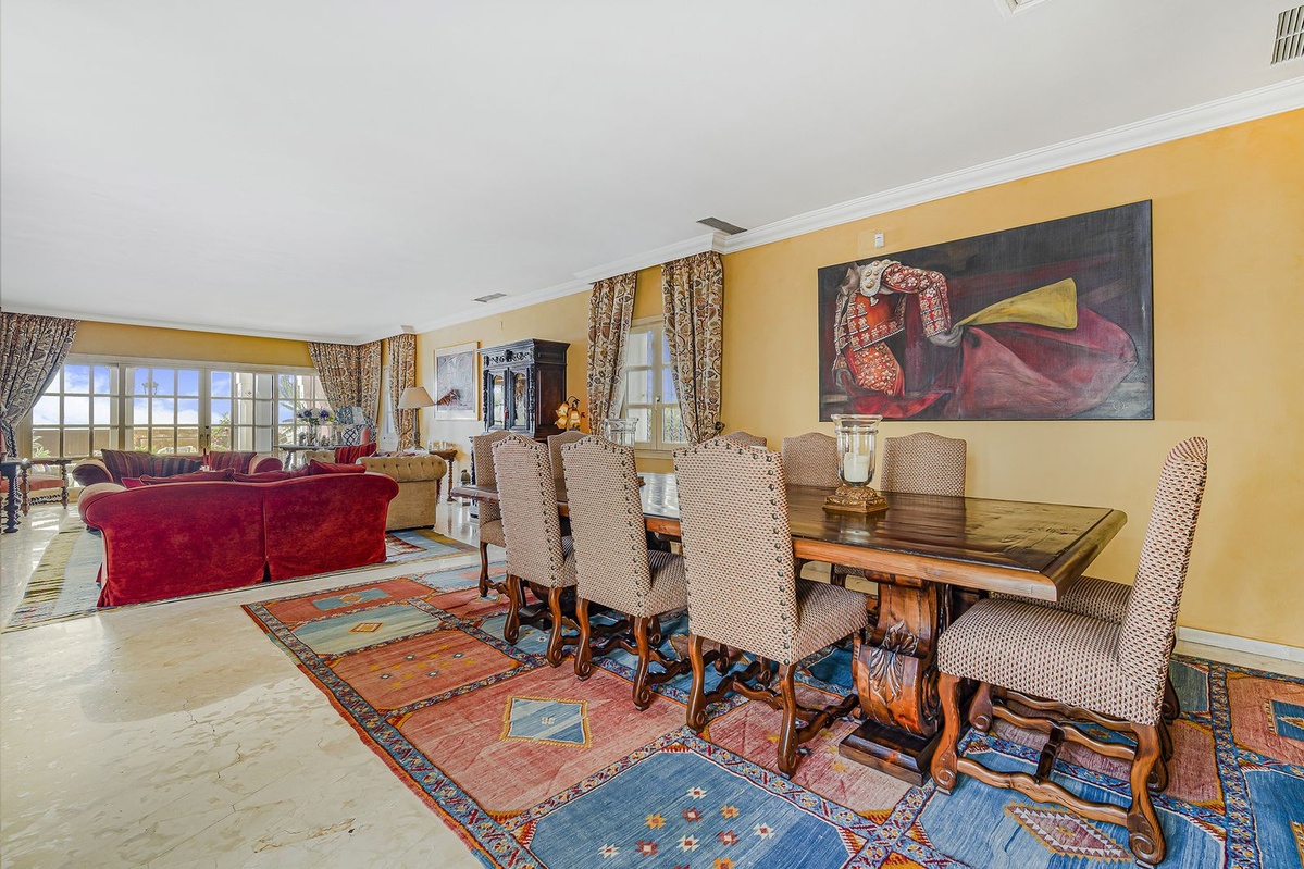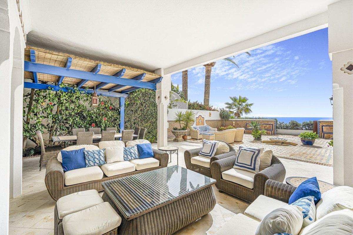 La casa principal ofrece una encantadora cocina clásica azul y blanca, así como un generoso comedor y salón desde donde puede acceder al primero de muchos patios.Desde aquí puede ver la puesta de sol con estilo desde una mezcla de áreas de relajación abiertas y abiertas para aquellos que buscan sombra del sol de verano.