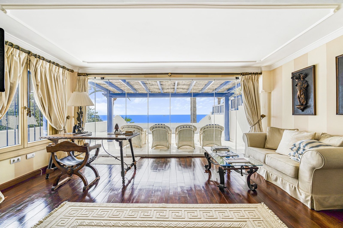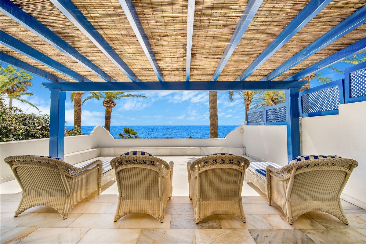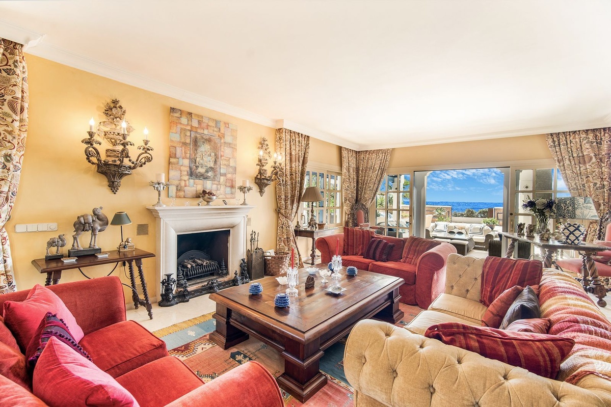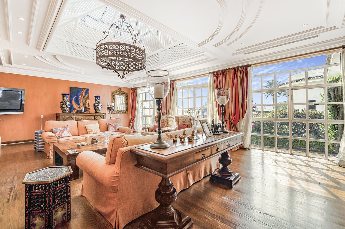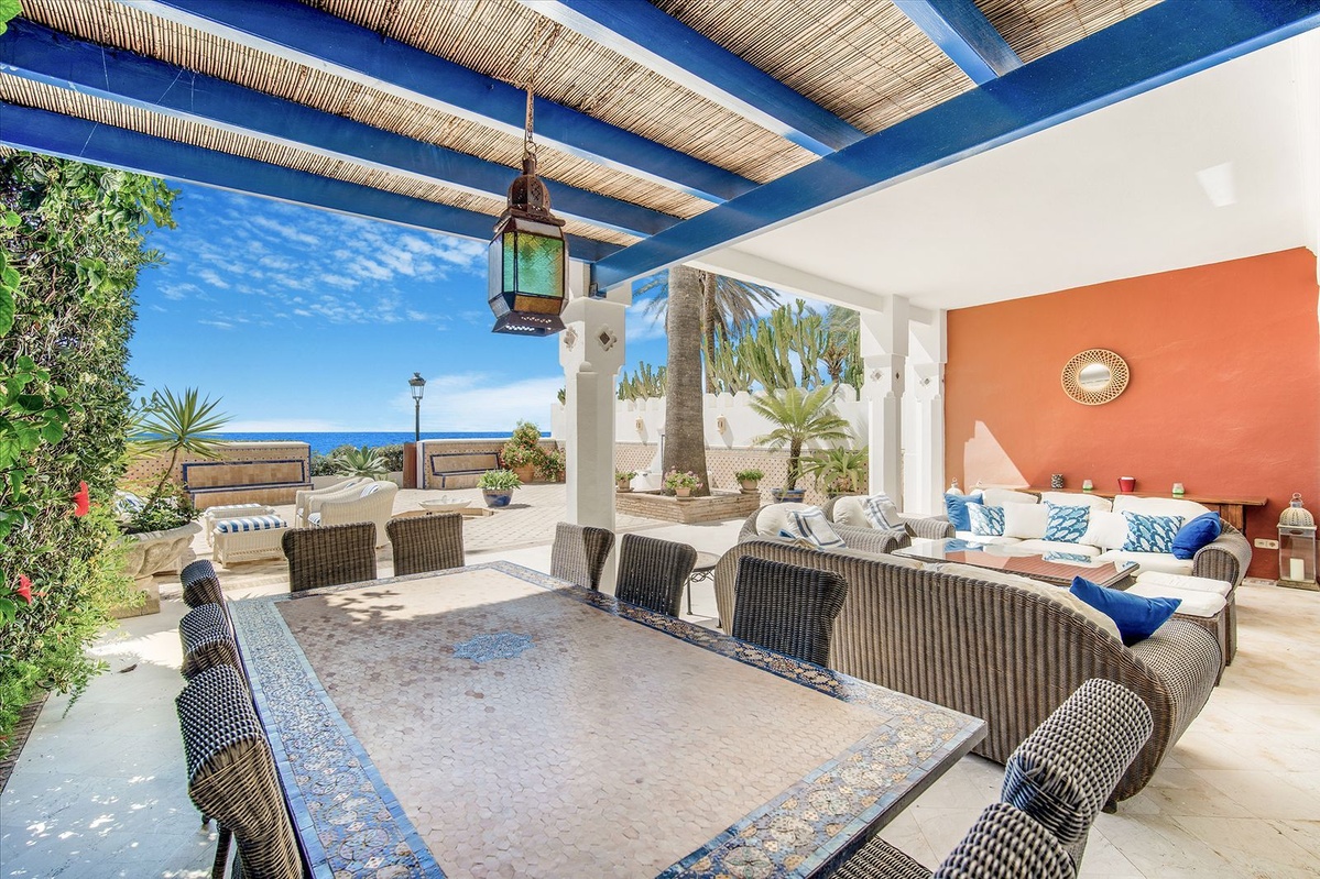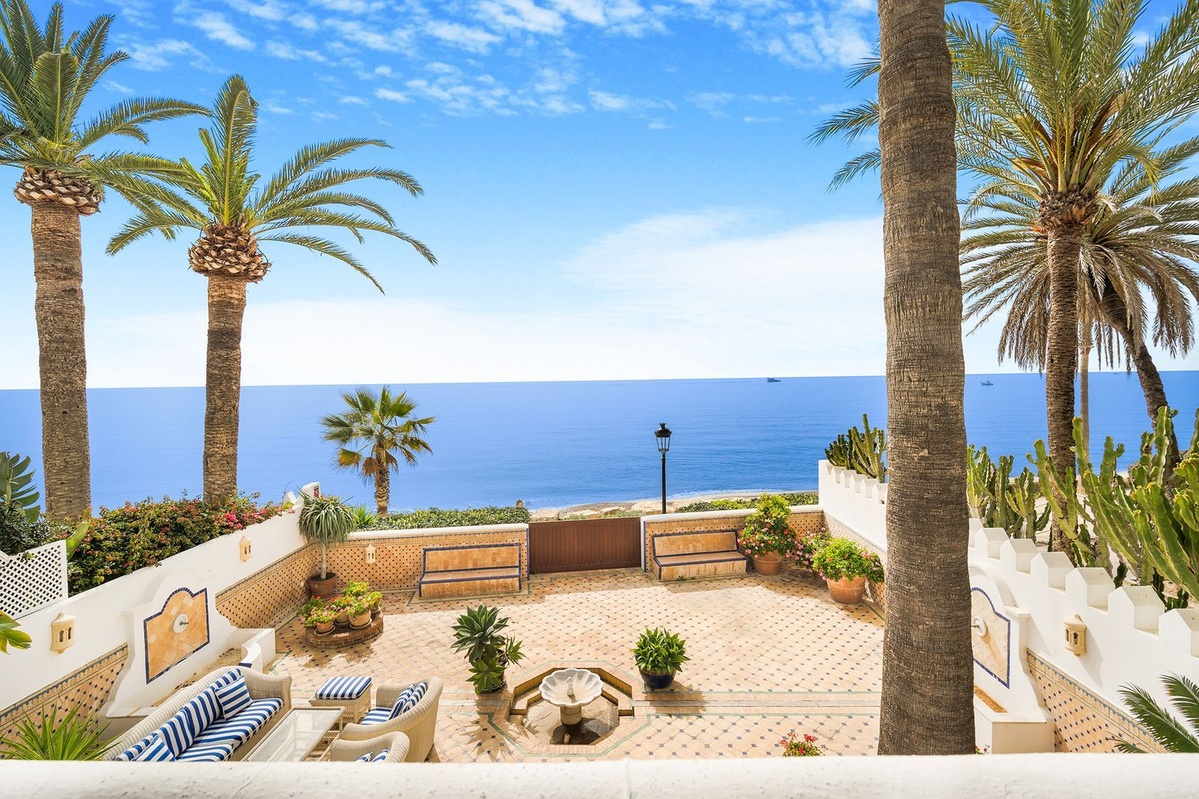 Ubicado en el corazón de la milla dorada, esta exquisita villa de 5 dormitorios de estilo morisco es una de las pocas casas que realmente pueden afirmar que es la playa de primera línea.Con acceso directo directamente a la arena, no hay nada que te separe de la costa y las impresionantes vistas del mar Mediterráneo.