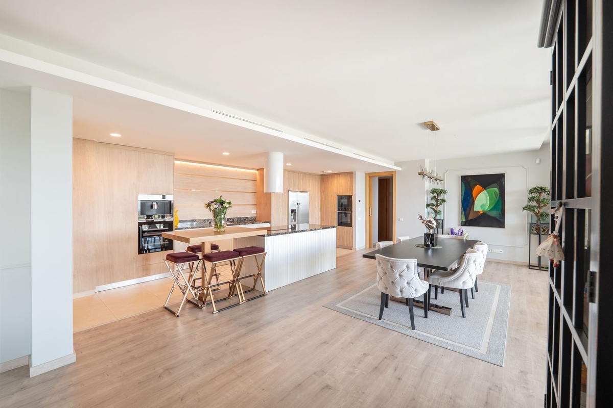 The apartment includes bespoke interior and exterior finishes, an innovative use of space with seamless indoor-outdoor integration, and an abundance of natural light. The large open-plan kitchen comes with a cooking island, breakfast bar, and a dedicated dining area, complemented by an integrated living room. It is equipped with modern amenities such as air conditioning for cooling and heating, fitted wardrobes, and a fully fitted kitchen with all appliances. The apartment also includes 3 underground parking spaces and 2 storage rooms, and features high-quality materials like ceramic, wood, and marble floors.
