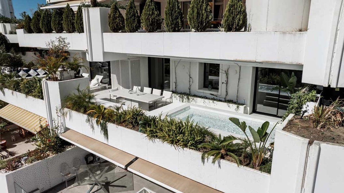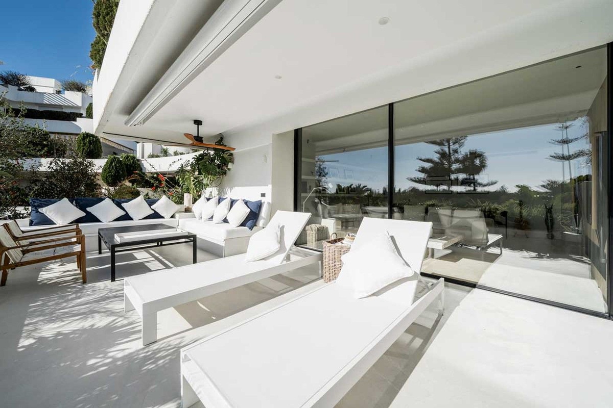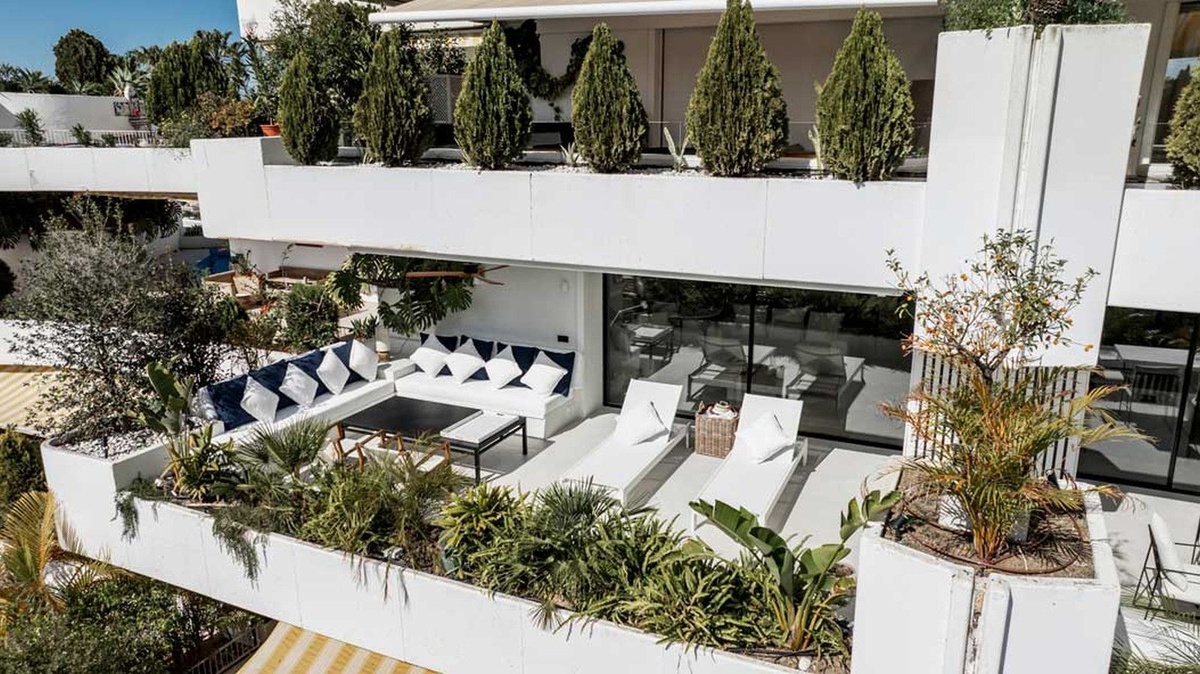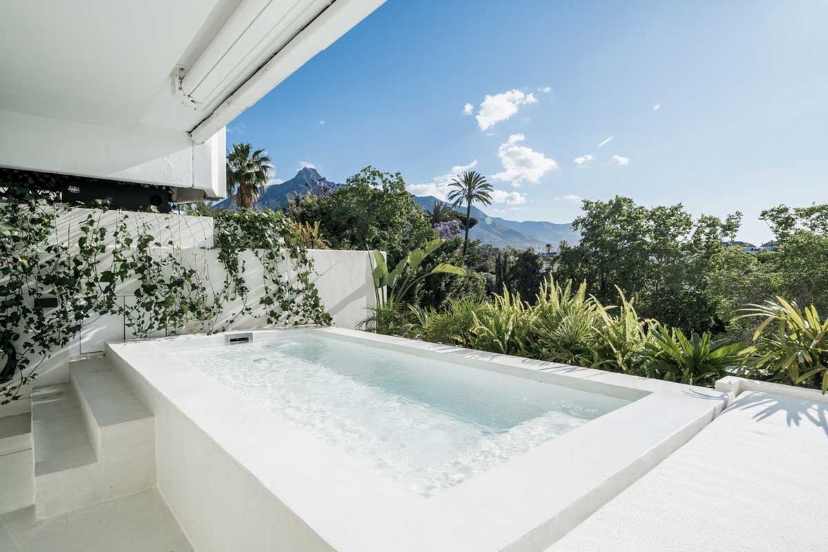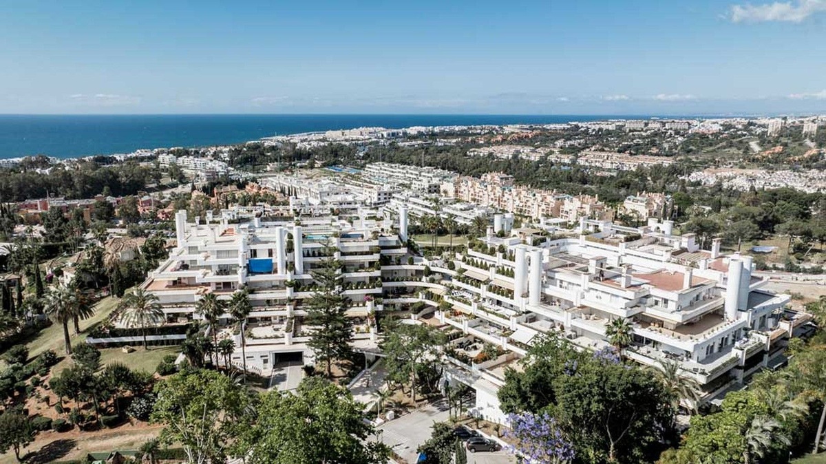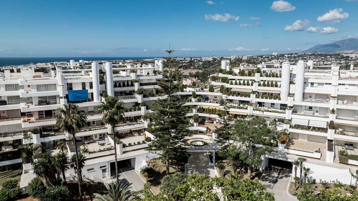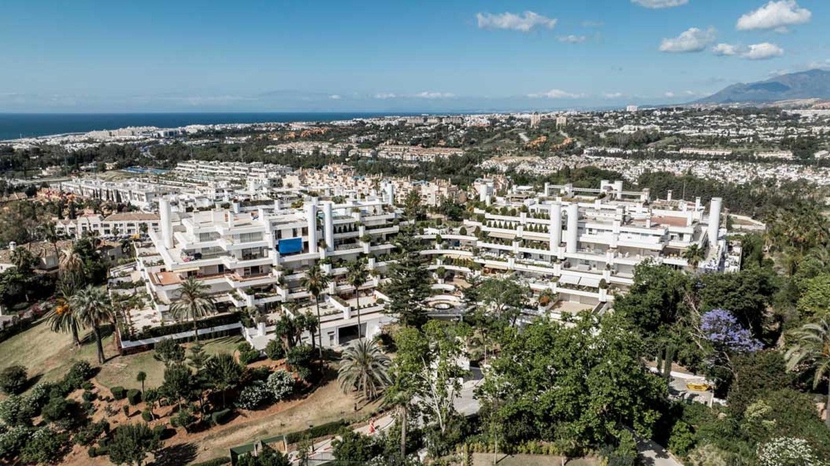 Este exquisito apartamento en Terrazas de Las Lomas, diseñado por el reconocido arquitecto Fernando Higueras, está ubicado en el corazón de la prestigiosa milla dorada de Marbella y los apos.