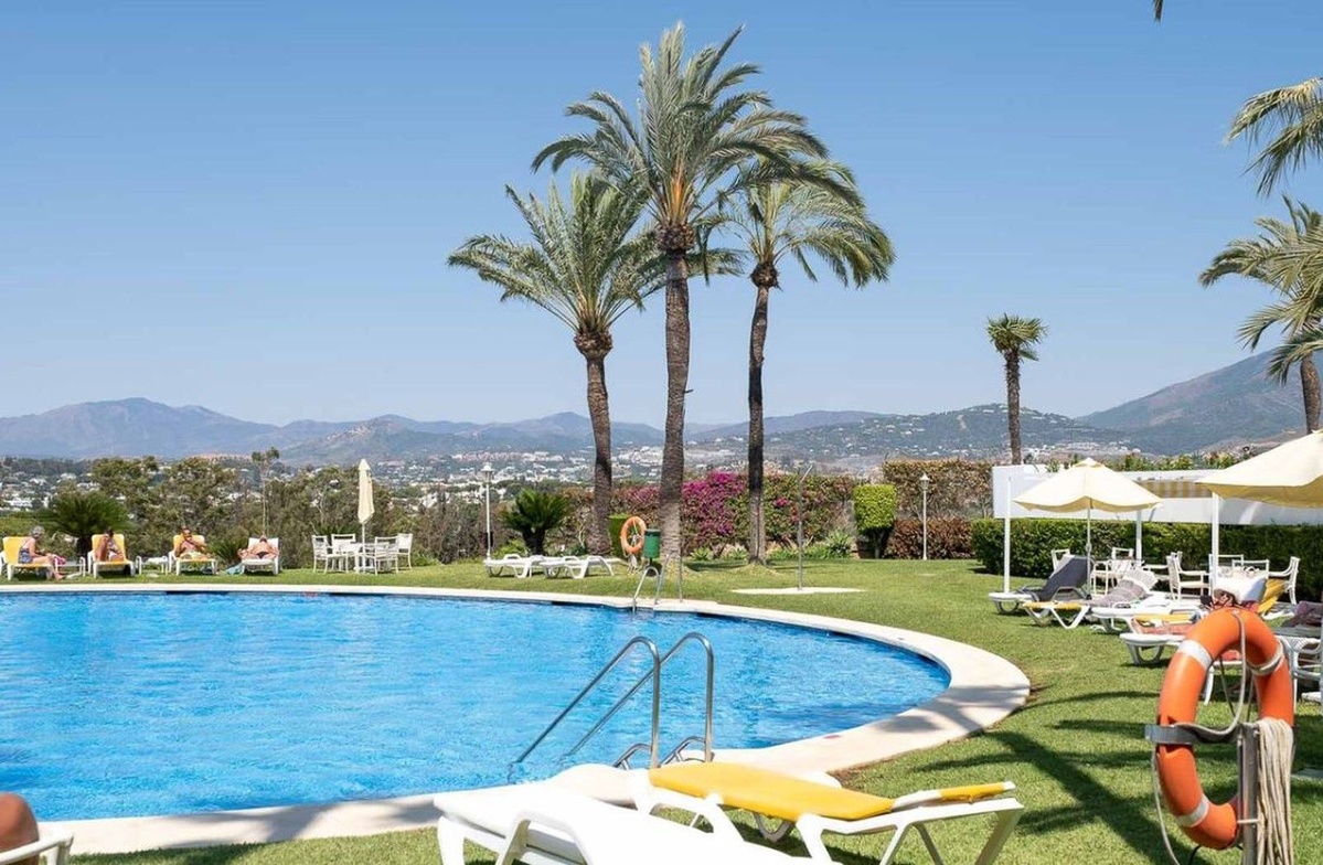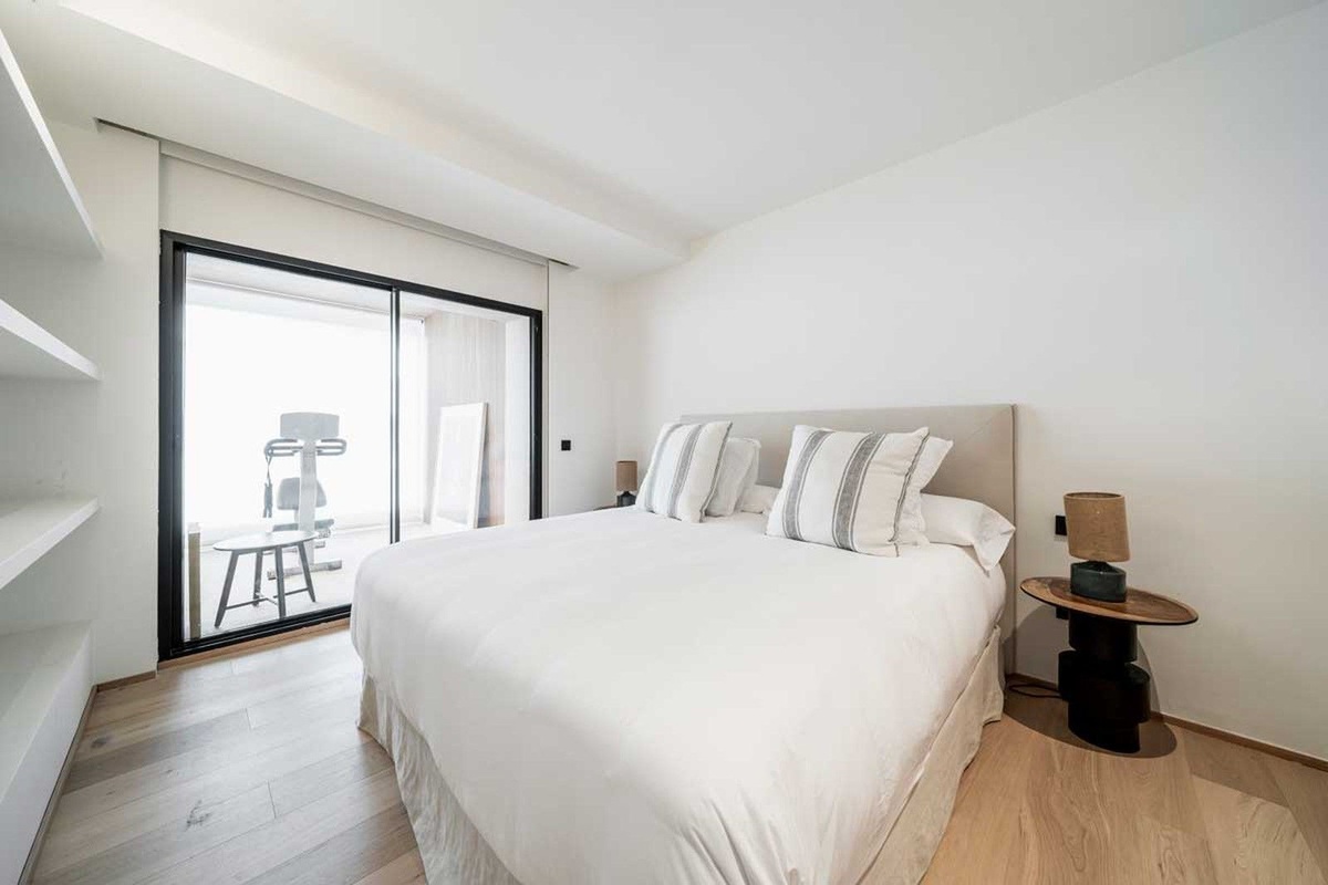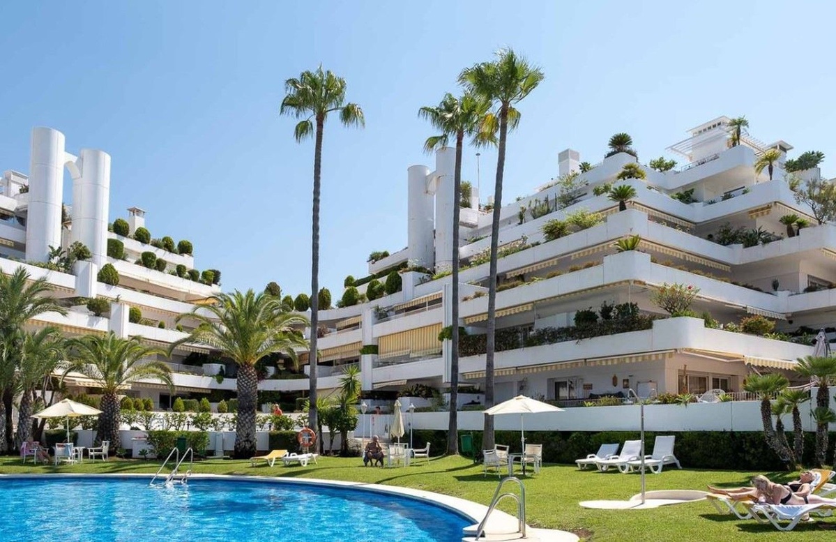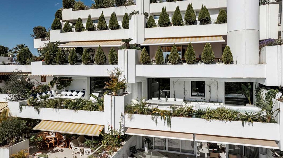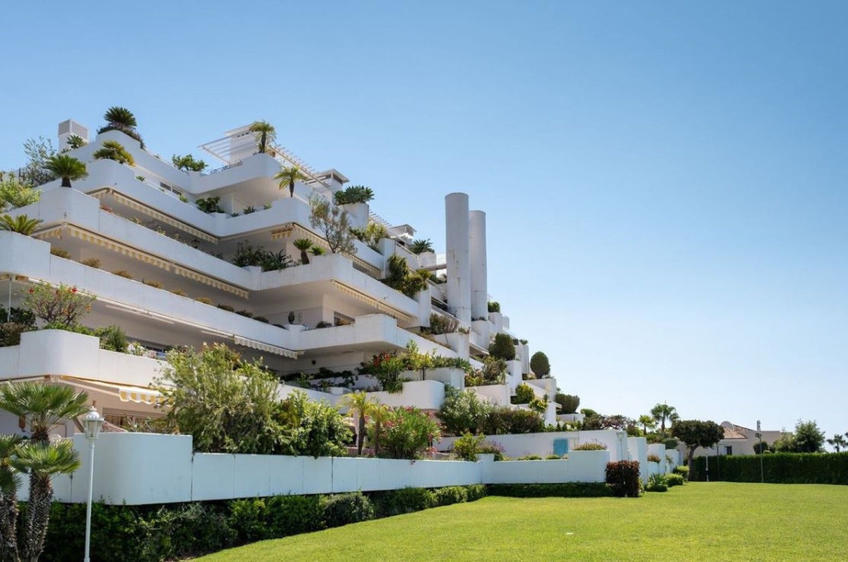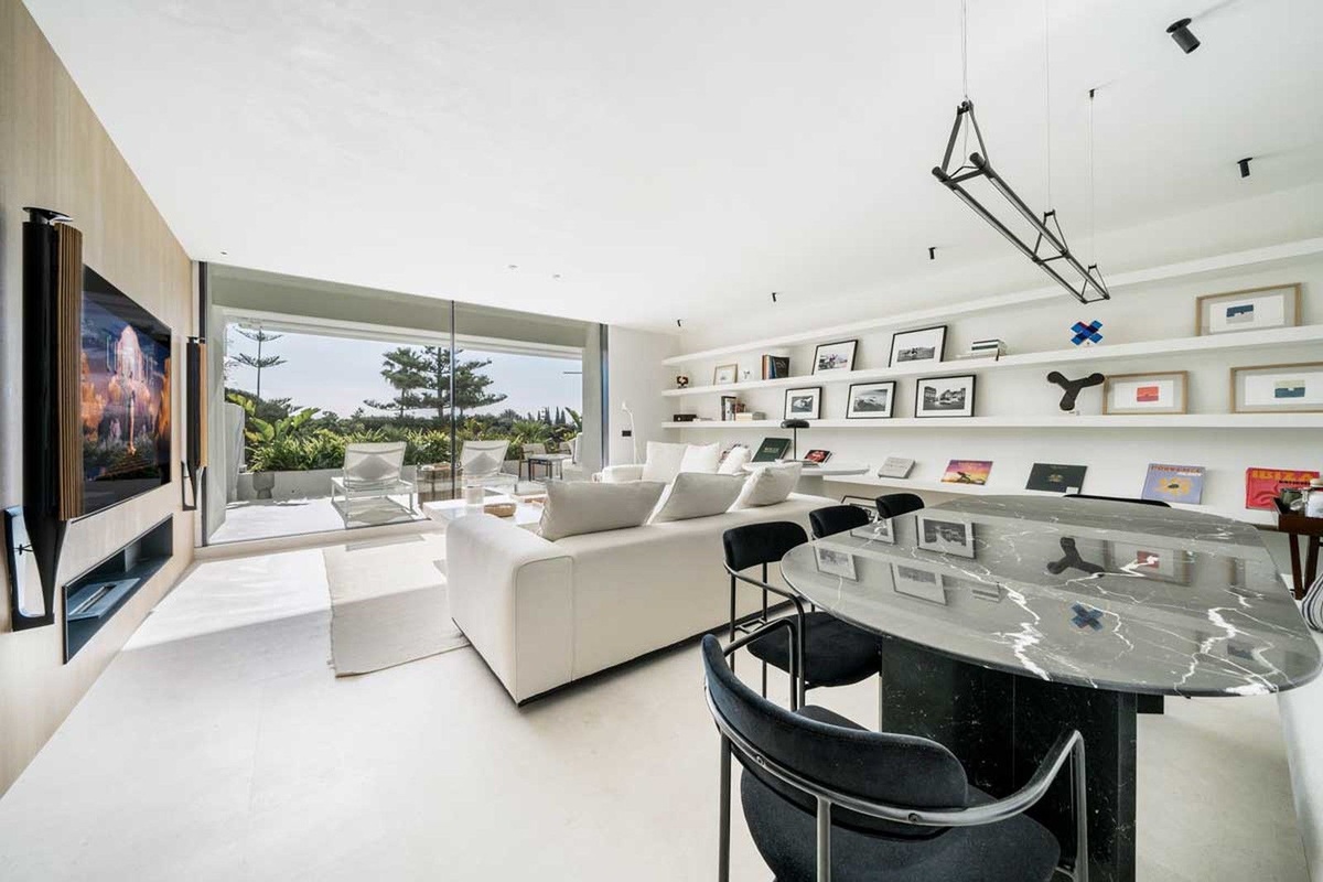 Este exquisito apartamento en Terrazas de Las Lomas, diseñado por el reconocido arquitecto Fernando Higueras, está ubicado en el corazón de la prestigiosa milla dorada de Marbella y los apos.