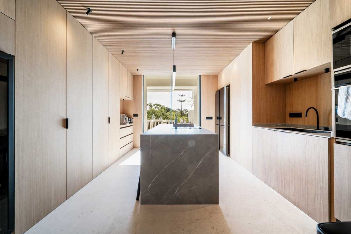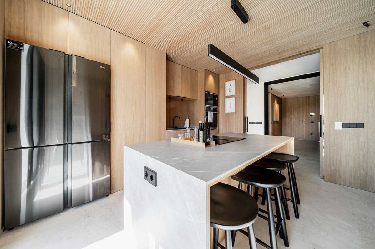 La cocina totalmente equipada cuenta con paneles de madera de roble, agregando un toque de calidez y elegancia al diseño moderno.Esta cocina no solo es elegante sino también funcional, que atiende a todas las necesidades culinarias.