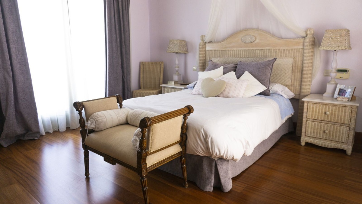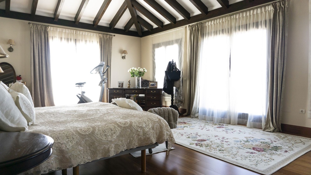 The upper floor is dedicated to the master suite, where wooden flooring adds warmth and elegance.